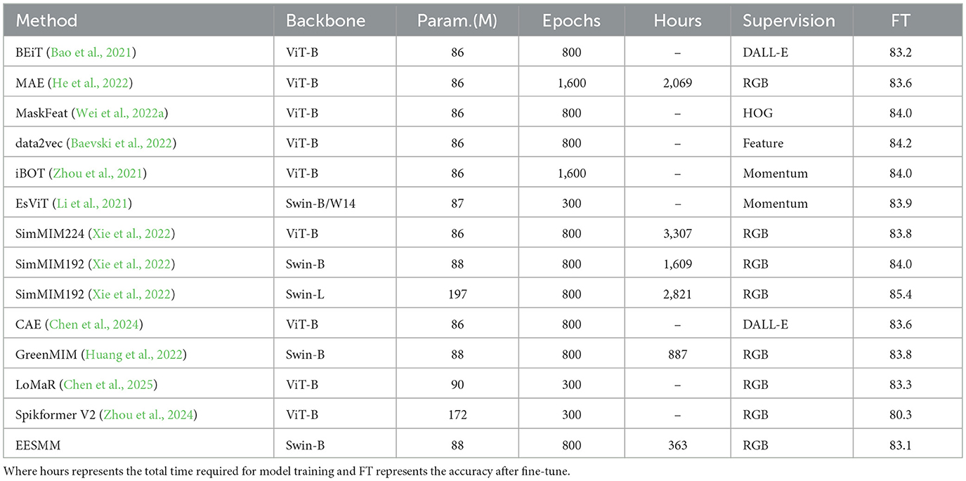 GreenMIM (Huang et al., 2022) is an improvement on the traditional SimMIM method, introducing more efficient mask design and optimized model structure, reducing the amount of computation, thus improving the speed of SimMIM pre-training, and more suitable for large data sets and high-resolution images. Although GreenMIM further improves the computational efficiency of SimMIM, GreenMIM still relies on the single feature reconstruction method, that is, the mask design is used to optimize the network, so it does not fundamentally reduce the reconstruction computation of a single image (He et al., 2022; Baevski et al., 2022).
