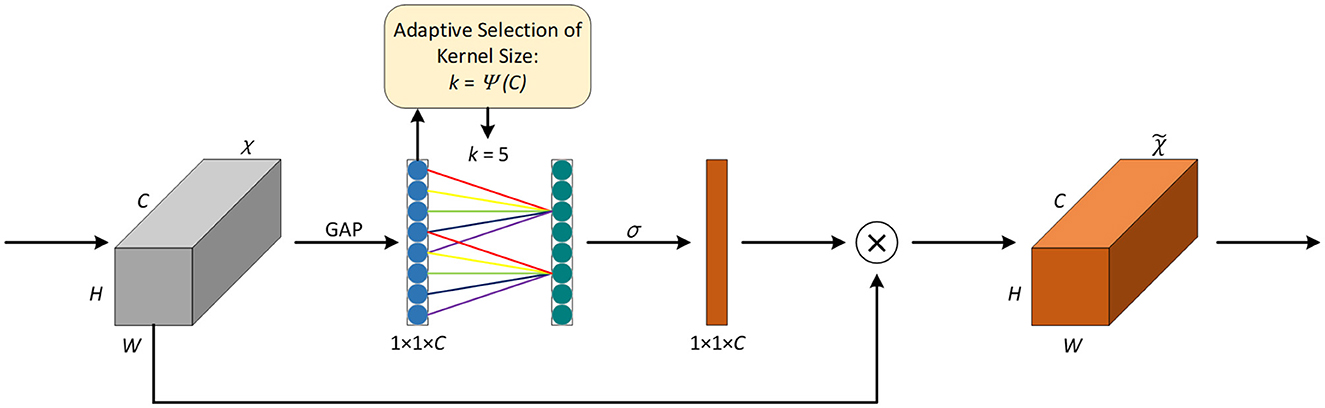 Given the vector g(χ), information interaction across channels is performed according to Equation 8 to obtain the weight of each channel. The ECA module is implemented using a quick one-dimensional convolution with a kernel size of k, as shown in Equation 9.