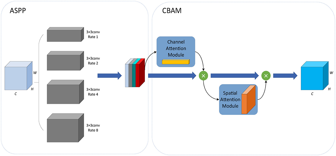 Based on the idea of spatial pyramid pooling (SPP) (He et al., 2015), the ASPP (Chen et al., 2017) module is the combination of SPP and dilated convolution. It employs multiple dilated convolutions with different sampling rates, which can capture local information of different scales so as to obtain the feature maps of different receptive fields. The Convolutional Block Attention Module (CBAM) (Woo et al., 2018) module introduces a spatial attention mechanism into a channel attention mechanism, consisting of the channel attention module (CAM) and spatial attention module (SAM). It can continuously generate attention feature maps of channels and spatial dimensions, and the final feature map is generated by multiplying them with the input feature map for adaptive feature correction. To further enhance the feature extraction capability of the ASPP module, Zhu et al. (2022) integrated the CBAM module into the ASPP module and proposed the CBAM-ASPP module, as shown in Figure 3. It makes the two modules complement each other to enhance the extraction of context information of different scales.