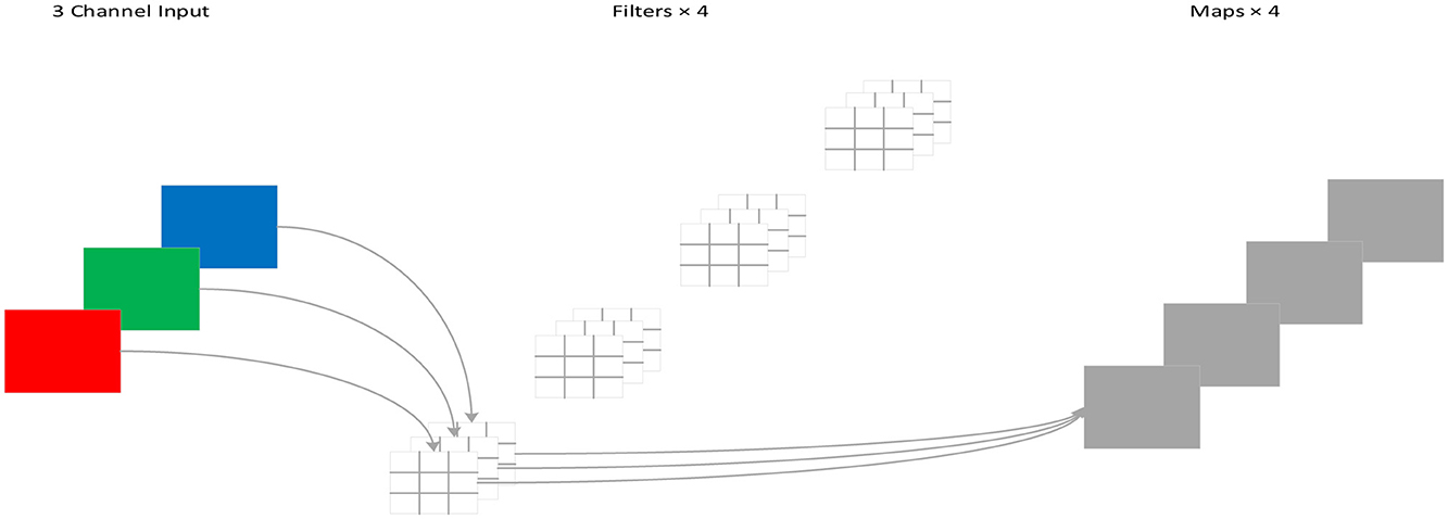 For standard convolution, both spatial features and channel features are learned during the process of convolution, as shown in Figure 4. DSC, proposed by Howard et al. (Chollet, 2017), decouples the spatial correlation and channel correlation of the convolution layer into depthwise convolution and pointwise convolution through a transition layer, as shown in Figure 5. Compared to standard convolution, DSC considers the spatial correlation and channel correlation, respectively, greatly reducing the number of parameters and computation cost.