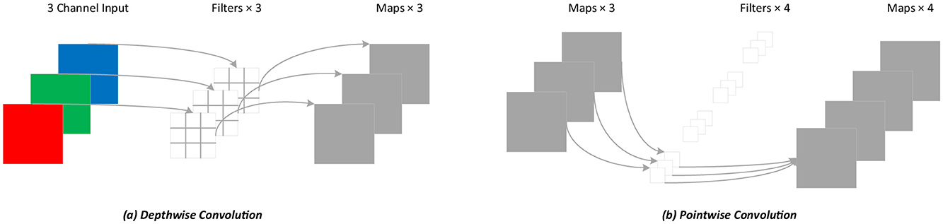 Figure 5. Depthwise separable convolution process. (A) Depthwise convolution; (B) Pointwise convolution.