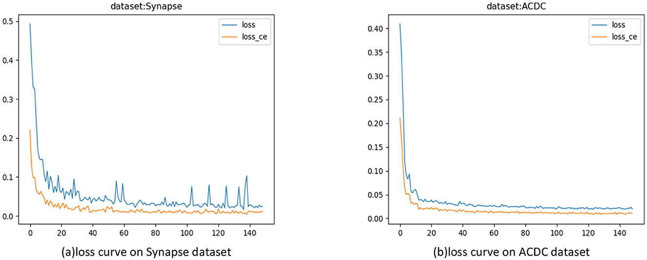 Figure 6. Model training loss curves. (A) Loss curves on the Synapse dataset; (B) Loss Curve on the ACDC Dataset.
