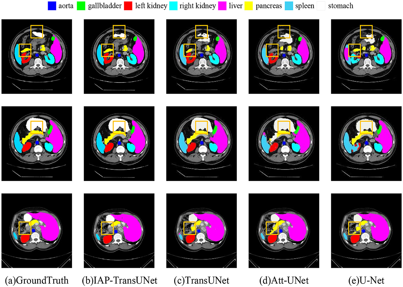 Figure 7. Segmentation results of the different networks on the Synapse multi-organ segmentation dataset. (a) Ground Truth, (b) IAP-TransUNet, (c) TransUNet, (d) Att-UNet, (e) U-Net.
