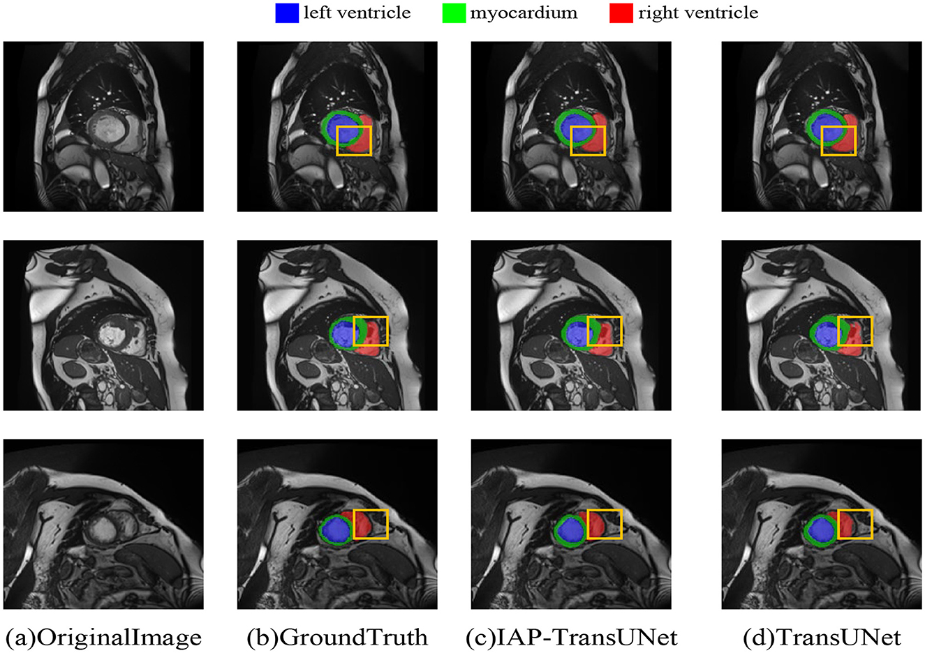Figure 8. Segmentation results of the different networks on the ACDC dataset. (a) Original Image, (b) Ground Truth, (c) IAP-TransUNet, (d) TransUNet.