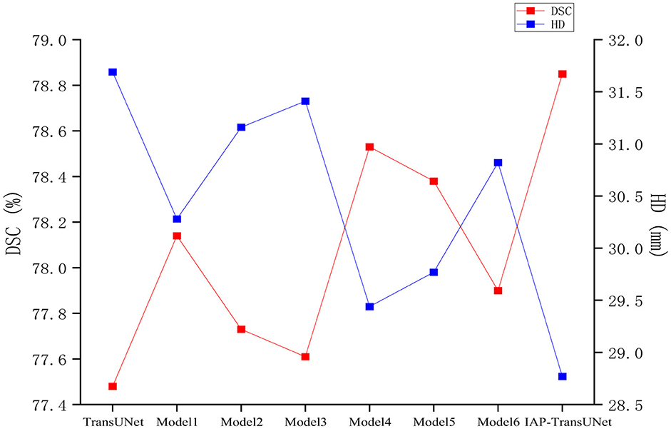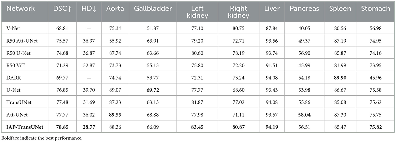 Results: The experiments based on the Synapse multi organ segmentation dataset and ACDC dataset showed that the proposed IAP-TransUNet achieved Dice similarity coefficients (DSCs) of 78.85% and 90.46%, respectively. Compared with the state-of-the-art method, for the Synapse multi organ segmentation dataset, the Hausdorff distance was reduced by 2.92%. For the ACDC dataset, the segmentation accuracy of the left ventricle, myocardium, and right ventricle was improved by 0.14%, 1.89%, and 0.23%, respectively.