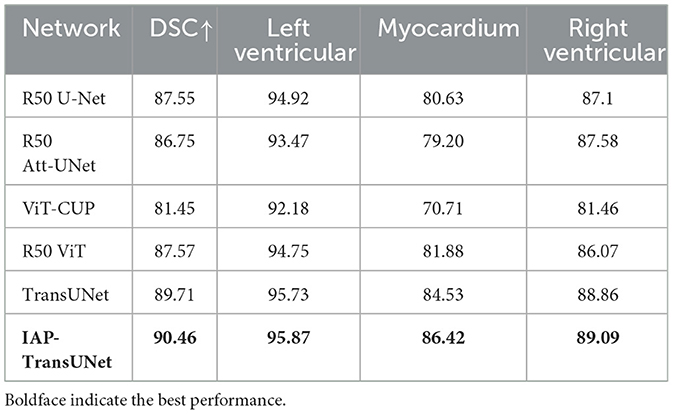 The segmentation results based on the ACDC dataset are shown in Table 2. The results reflected that IAP-TransUNet showed good segmentation performance, with a Dice coefficient of 90.46%. Compared to the baseline model TransUNet, IAP-TransUNet improved the segmentation accuracy of the left ventricle, myocardium, and right ventricle by 0.14%, 1.89%, and 0.23%, respectively, outperforming mainstream models. The experimental results showed that the proposed IAP-TransUNet has good generalization ability and robustness.