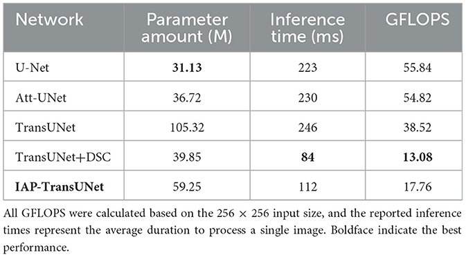 A direct analysis of the trade-off between accuracy and model size revealed the core advantage of our architecture. As shown in Tables 1, 3, the standard U-Net was the most lightweight model (31.13 M parameters) but provided lower accuracy (76.85% DSC). The baseline TransUNet was the heaviest (105.32 M) with an accuracy of 77.48% DSC. Our IAP-TransUNet (59.25 M) positioned itself optimally on this spectrum. It decisively outperformed U-Net in accuracy for a moderate increase in size while simultaneously achieving higher accuracy than the much larger TransUNet. This demonstrates a significantly improved performance-to-cost ratio, establishing our model as a more efficient and effective architecture.