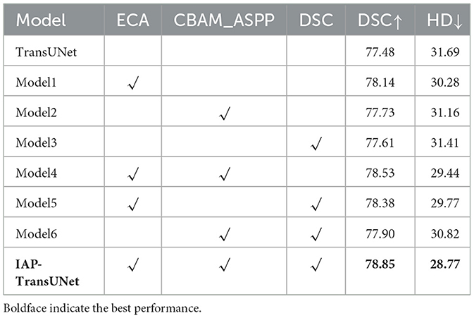 The segmentation results based on the Synapse dataset are shown in Table 1, indicating that the proposed IAP-TransUNet achieved the best segmentation performance, with the DSC reaching 78.85% and the HD reduced to 28.77%. Compared to TransUNet, IAP-TransUNet increased the DSC by 1.37% and reduced the Hausdorff distance by 2.92%.
