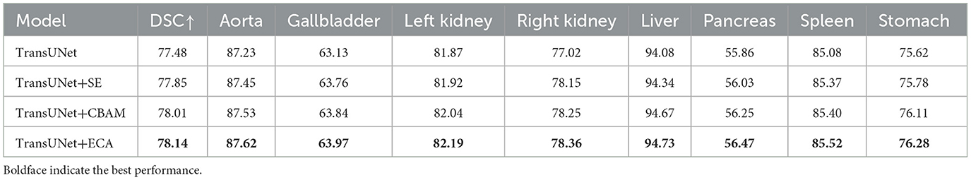 (2) Impact of the attention mechanism. To compare the impact of the ECA mechanism with other attention mechanisms, experiments were conducted by integrating the SE attention mechanism, CBAM attention mechanism, and ECA mechanism into the same network layer of TransUNet. The results are shown in Table 5. The evaluation metric DSC of the models with the SE attention mechanism, CBAM attention mechanism, and ECA mechanism increased by 0.37%, 0.53%, and 0.66%, respectively. The results indicate that the ECA mechanism can adaptively adjust the weights of channels by learning the correlations between channels, which can achieve higher segmentation accuracy.