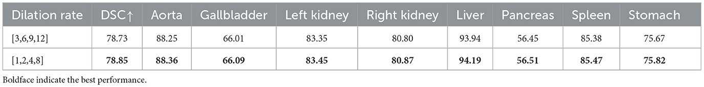 The experiments were conducted in an environment with Python 3.7 and PyTorch 1.8.1, using an NVIDIA RTX 3090 GPU with 24 GB of memory. To increase data diversity and prevent overfitting, a standard on-the-fly data augmentation strategy was employed during training. This involved applying both horizontal and vertical flips, each with a probability of 0.5, and randomly rotating the images within an angle range of [−10, 10] degrees. This specific augmentation set was chosen to enhance model robustness while avoiding unrealistic anatomical distortions (Namozov and Im Cho, 2018). The detailed parameter settings were as follows: an input image resolution of 256 × 256, a patch size of 16, a batch size of 24, and expansion rates of the CBAM-ASPP module [1,2,4,8]. In addition, the model was trained using the SGD optimizer (Zhang et al., 2018) with a momentum of 0.9, a learning rate of 0.01, and a weight decay of 0.0001.