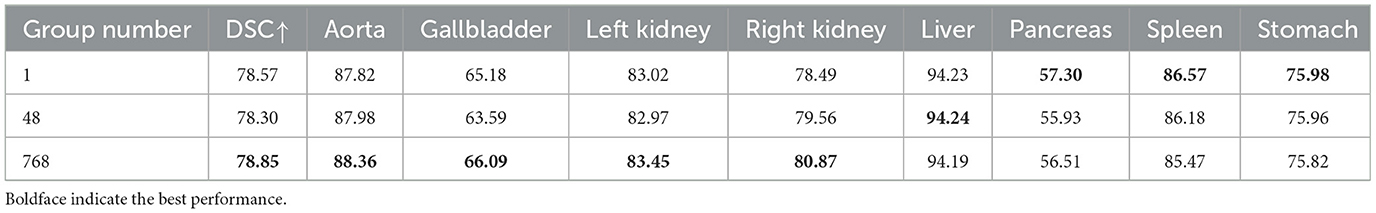 (4) Impact of the convolution group number. To investigate the impact of convolutions with different group numbers on segmentation performance, experiments were conducted using convolutions with group numbers 1, 48, and 768, and the results are shown in Table 7. Among them, group number 1 represents ordinary convolution, and group number 768 represents deep convolution. The experimental results showed that the convolution with group number 768 achieved more accurate segmentation results, so we chose deep convolution.