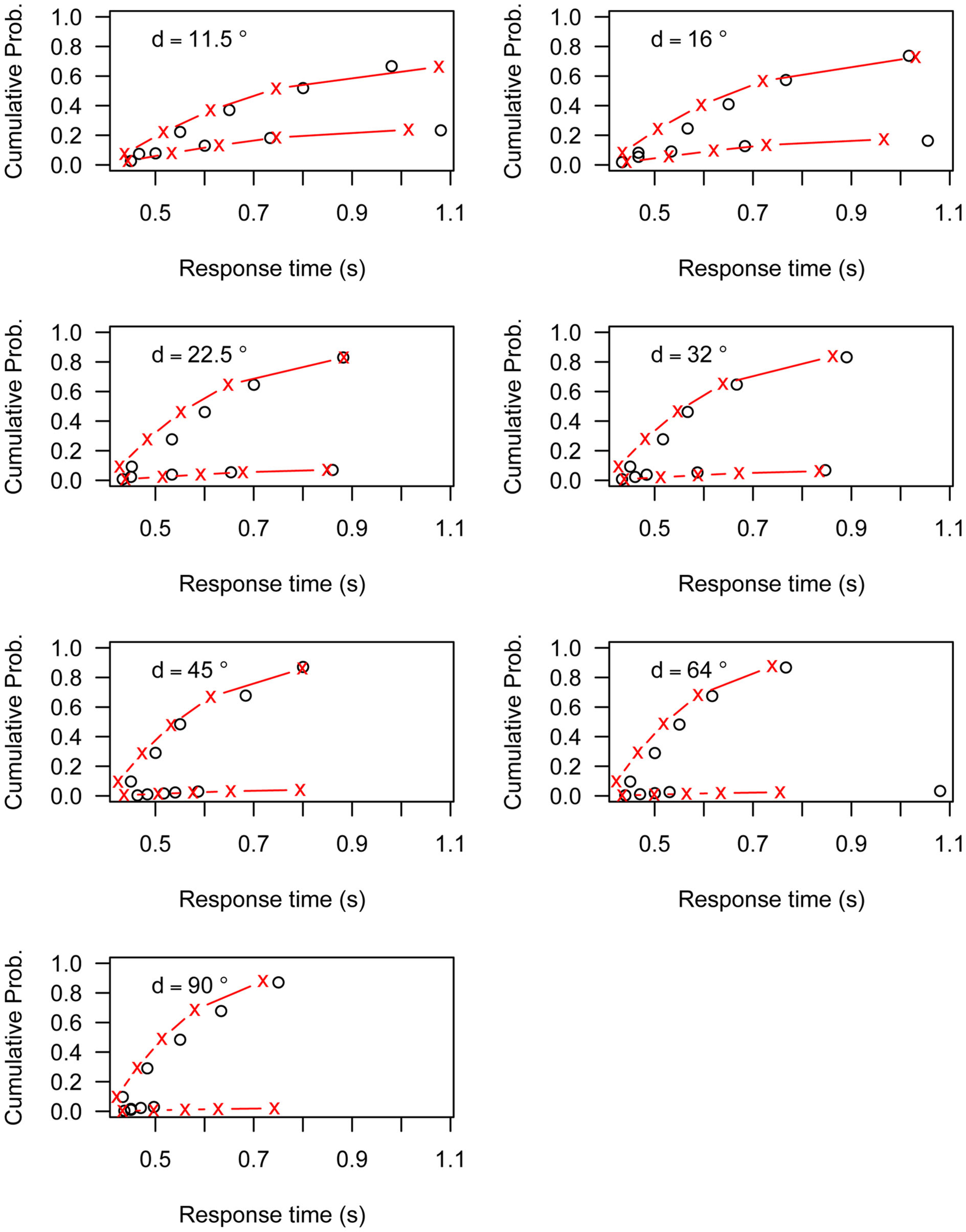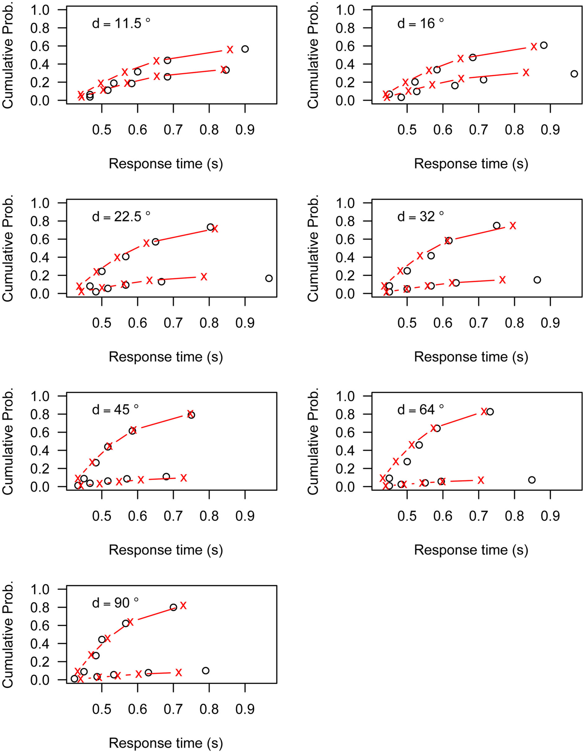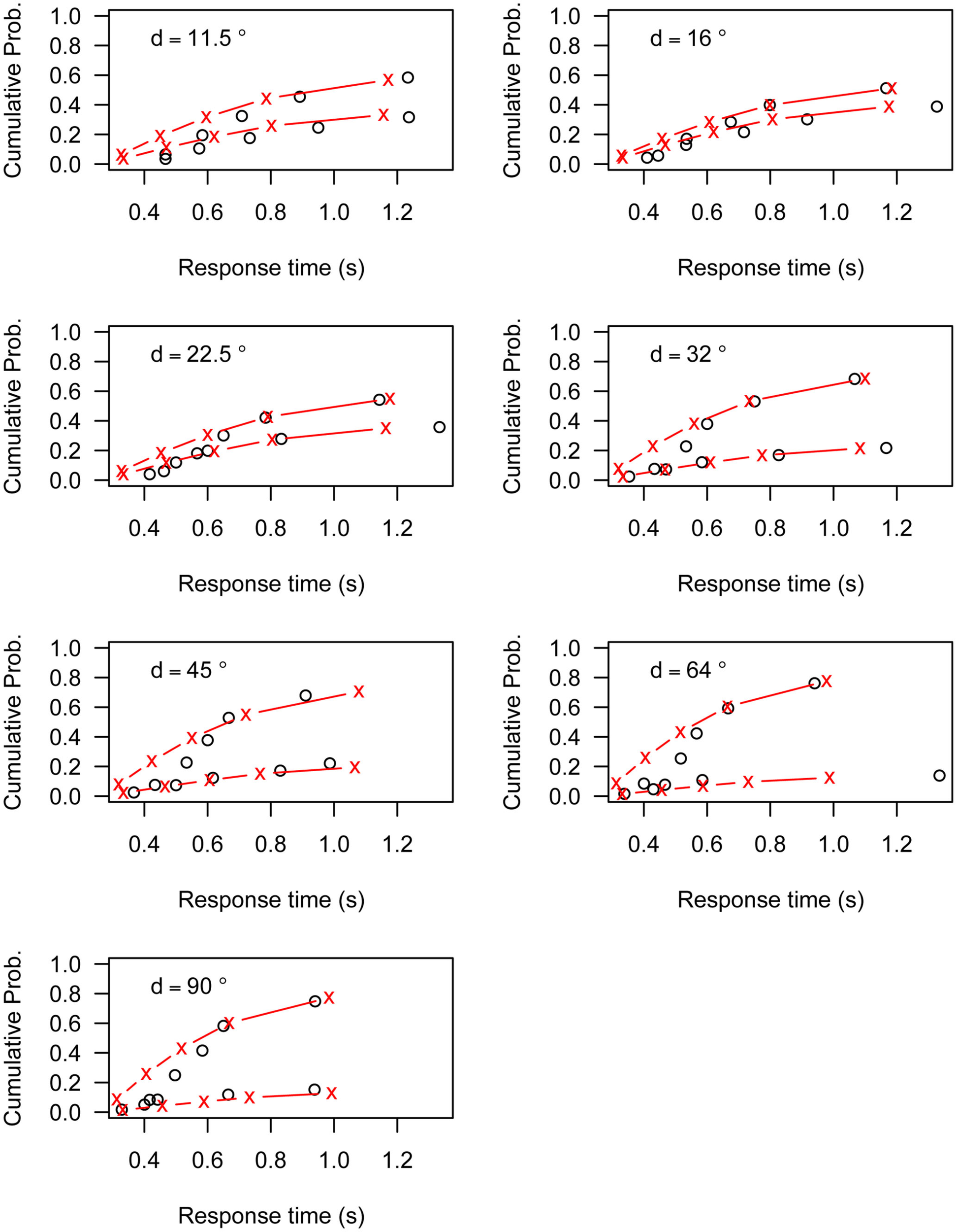 Figures A1–A6 present the fit of the Linear Ballistic Accumulator (LBA) model to the data of Experiment 1. Each figure represents the data (black circles) and model fit (red lines) for one participant. The top line represents the cumulative RT distribution of correct responses, the bottom line represents the cumulative RT distribution of incorrect responses. Both lines are weighted to the probability of an incorrect response. Each graph represents the different angular distances (d) used in Experiment 1.