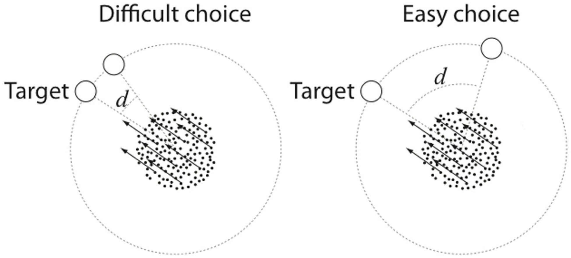 RDM stimulus display. A proportion of the dots move in a target direction indicated by the arrows, while the remaining dots move randomly. The discriminability of the target is manipulated by changing the angular distance (d) between the alternatives.