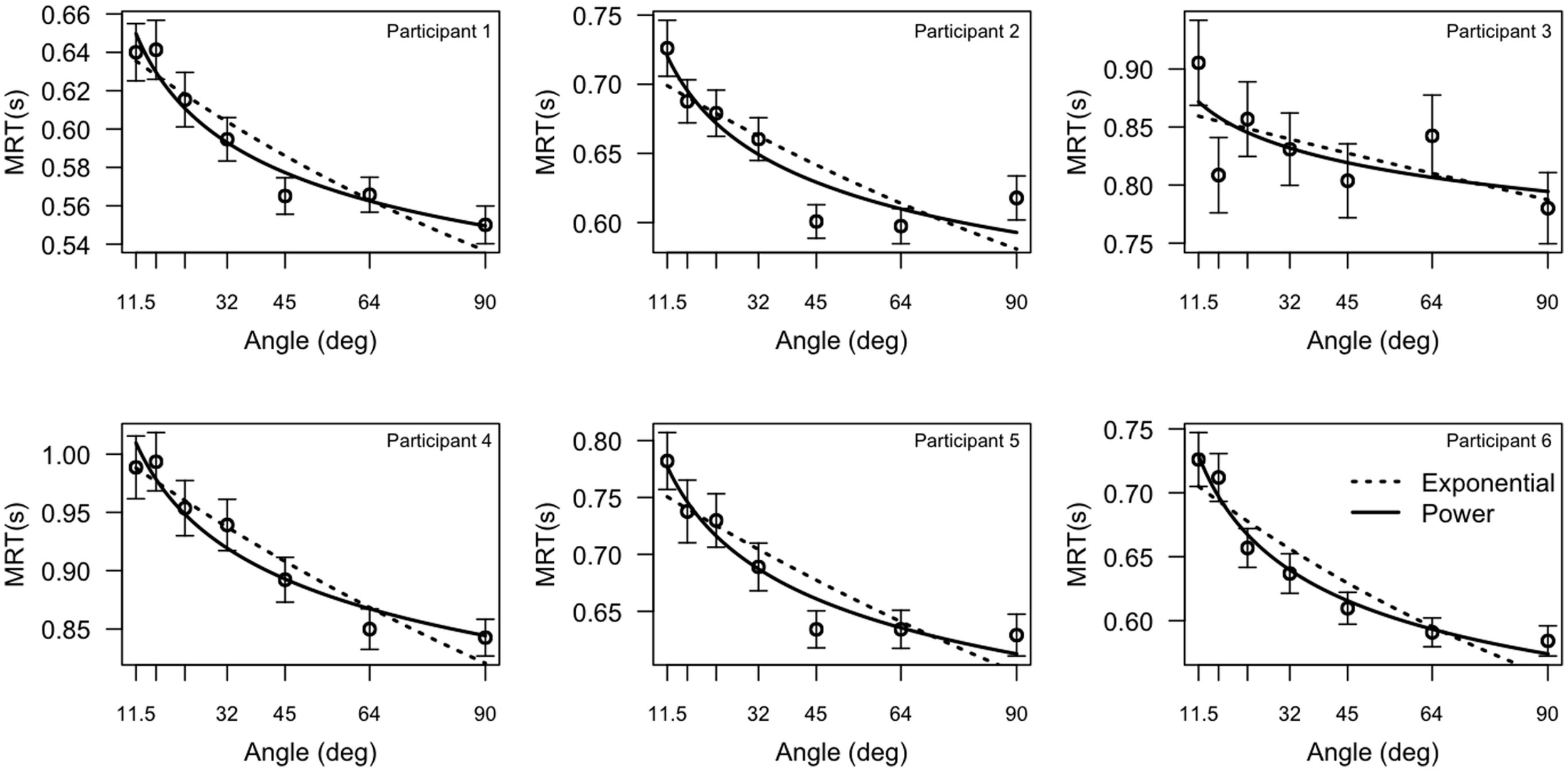 Mean response times (MRT) as a function of angular distance. Each plot represents the data from one participant. (Error bars represent within-subjects standard error of the mean, Loftus and Masson, 1994). The best fitting power function and the best fitting exponential function are overlaid.