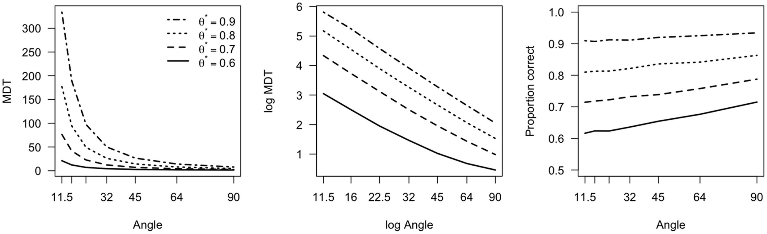 The results show that the power function was the best fitting model for all participants. Table 5 presents the goodness of fit for the exponential and power functions presented in Equations (3) and (2). The power function is consistently the better model, as indicated by the lower BIC values and higher correlations. Although the data of Participants 3 and 4 do not clearly distinguish between the models, the power function clearly is the better model for the remaining participants. In terms of the evidence ratio, the power function is 15 to 415 times more likely than the exponential function for these participants. This suggests that an increase in angular distance yields a power law decrease in MRT, and not an exponential law. The model comparison of the psychologically constrained models thus shows that behavior in 2AFC tasks is Piéron-like when the discriminability of choice alternatives is manipulated.