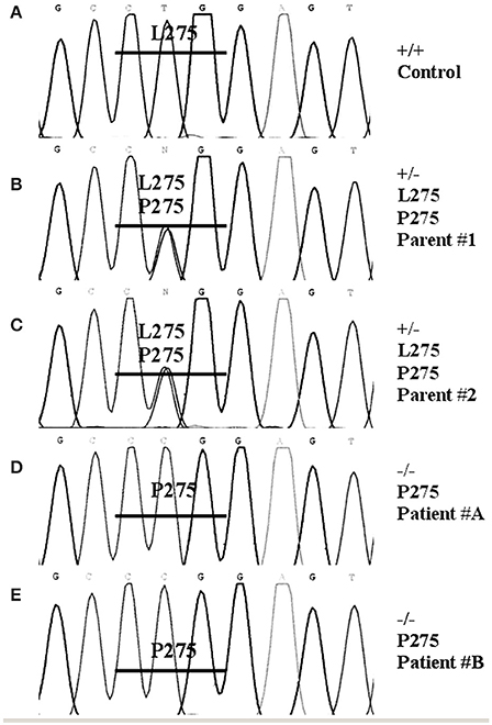 Figure 2. DNA sequencing. Genomic DNA was extracted from the blood of two patients, their two parents and a normal individual as control (A) using the Invitrogen DNAzol BD reagent. The seven exons of the STARD1 gene were PCR and sequenced. A mutation was found in exon 7. For exon 7 oligonucleotides used for PCR were (5′ to 3′) ATGAGCGTGTGTACCAGTGACG, (5′ to 3′) CCTGGCAGCCTGTTTGTGATAG; the annealing temperature was 60°C and the reaction processed for 30 cycles. The PCR products were sequenced. The mutation found in exon 7 was located at the amino acid residue 275, a leucine being substituted by a proline. The two parents (B,C) were +/−, and the two children (D,E) were −/−.