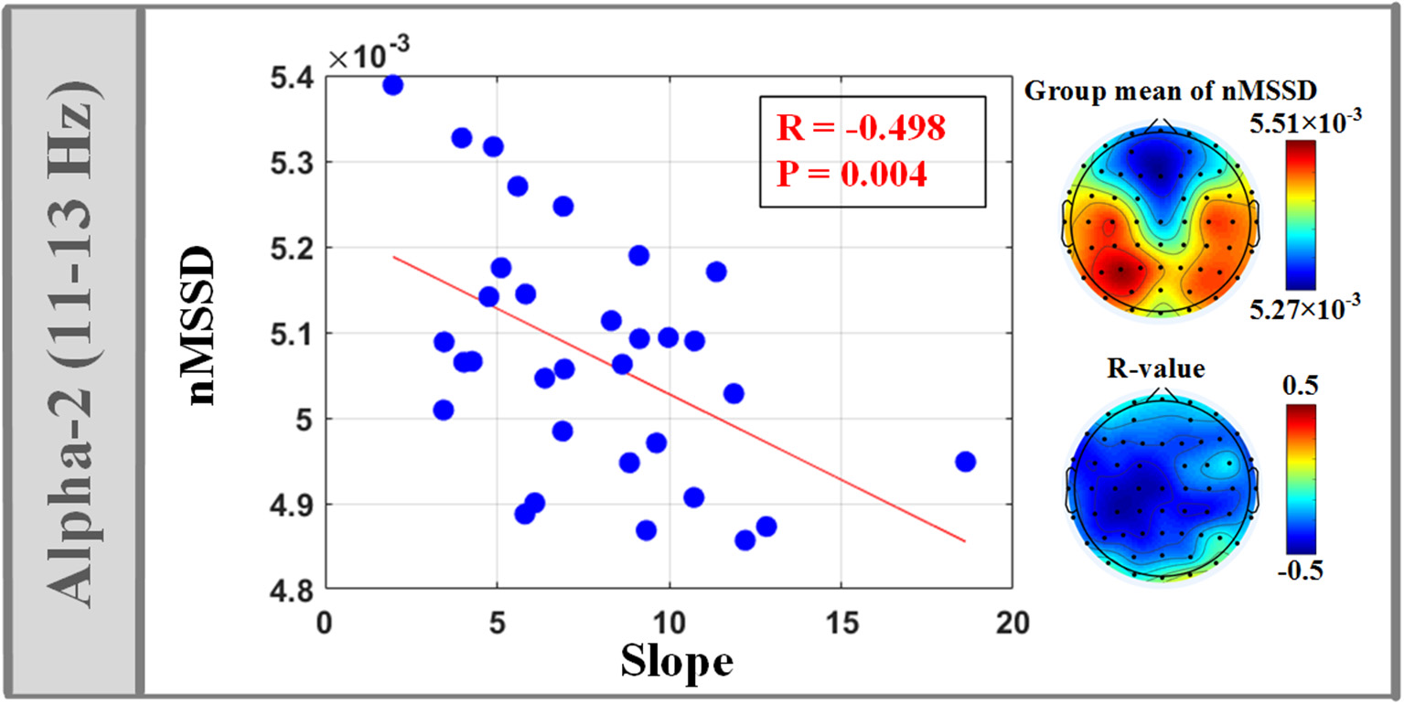 Figure 4. Significant correlation between temporal variability (nMSSD) of isEEG in alpha-2 band (11–13 Hz) and the fitting slope of the linear LEP-pain model (4).