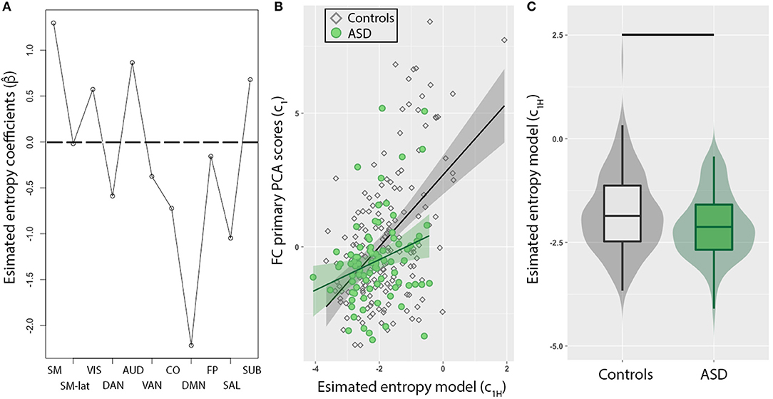 Figure 2. Resting-state network (RSN) entropy is a stronger predictor of functional connectivity (FC) for TD compared to ASD. (A) Model coefficients determined from elastic net method show sensory networks (SM, SM-lat, VIS, AUD, SUB) are positively weighted, while higher order cognitive networks (DMN, SAL, CO, DAN, VAN, FP) are negatively weighted. (B) Scatter plot showing the relationship between FC (PCA primary component projections) and entropy model for control (diamonds) and ASD (circles) individuals. The model was significantly weaker in predicting FC in ASD compared to controls (p = 0.02). (C) Box plot of entropy model distributions for control (gray) and ASD (green) groups. Horizontal black line denotes significant difference (p = 0.01).