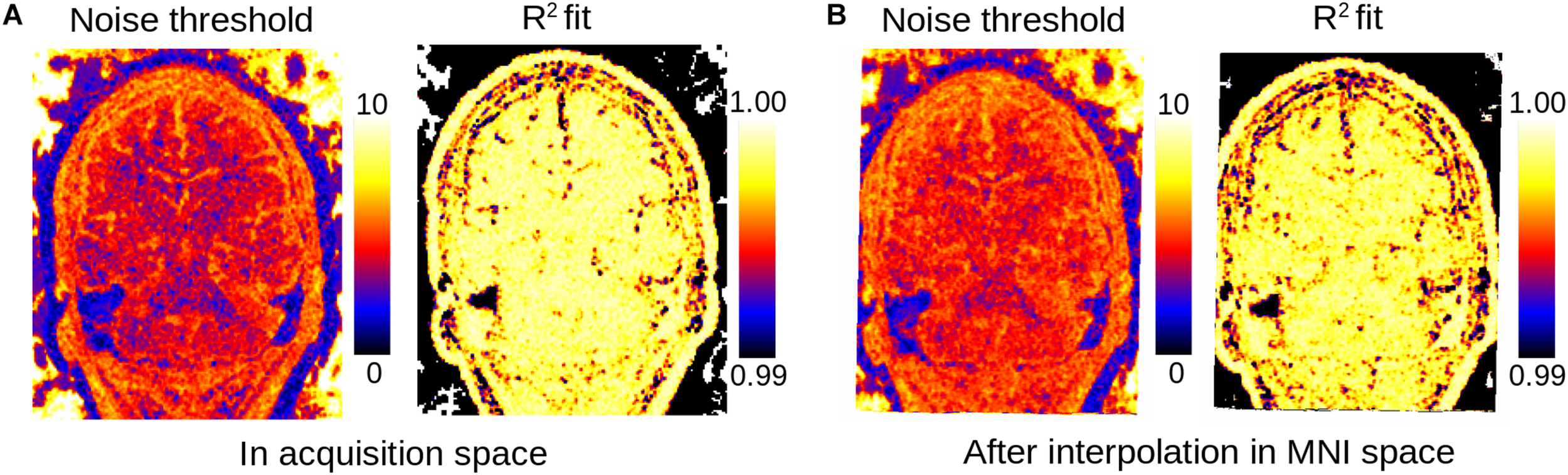 Previously proposed methods for local PCA denoising have shown decreased performance when handling interpolated data due to the changes in the noise distribution (Manjón et al., 2013; Veraart et al., 2016). To test the performance of our noise estimation approach, we co-registered our data to standard space by aligning it first with a whole brain image of the same subject and then to the MNI152 template at 0.5 mm resolution. Both registrations used the first inversion of the MP2RAGEME sequence, and were performed with linear registration in ANTS (Avants et al., 2008). Phase images were unwrapped before transformation to avoid interpolating across phase wraps, and quantitative maps were computed before and after denoising in standard space.