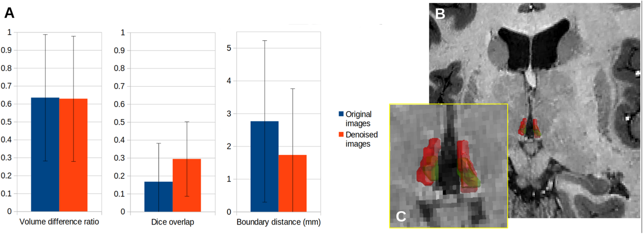 Comparison of manual delineations of the lateral habenula with or without denoising for the five subjects of the experiment. (A) Inter-rater agreement between delineations, (B) 3D rendering of the lateral habenula in one subject, as delineated by each rater (red and green outline, respectively), (C) Zoomed-in rendering.