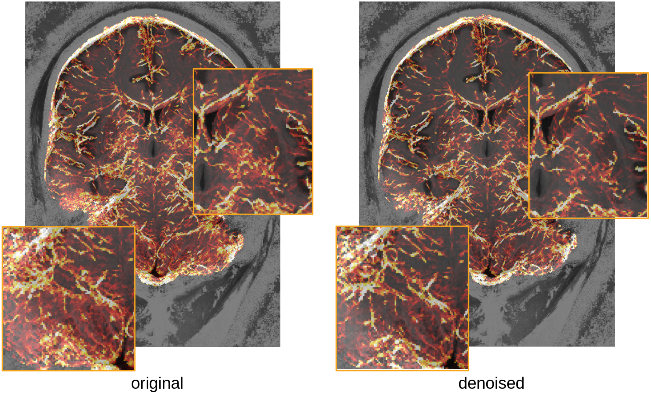 Brain vasculature is very difficult to image, as most of the vessels have sub-millimeter resolution even at the surface of the brain. Because most methods use local information to identify vessels, they are very sensitive to noise, and prone to large amounts of false detections. Figure 10 illustrates the potential benefits of the proposed denoising in separating vessels from noise, while preserving the fine details of the vasculature. A full test of the consistency of detected vessels across multiple scans would be needed to assess that the method does enhance vessels, however, it is worth noting that these fine structures are preserved in the denoising.