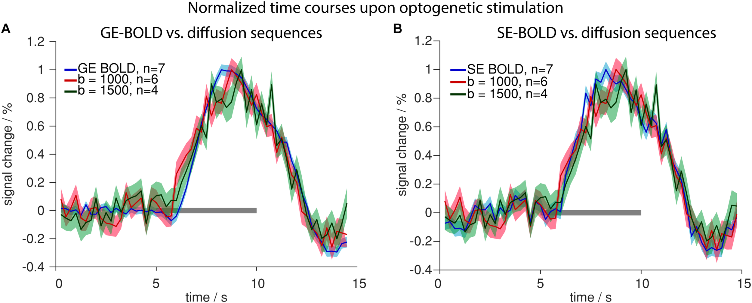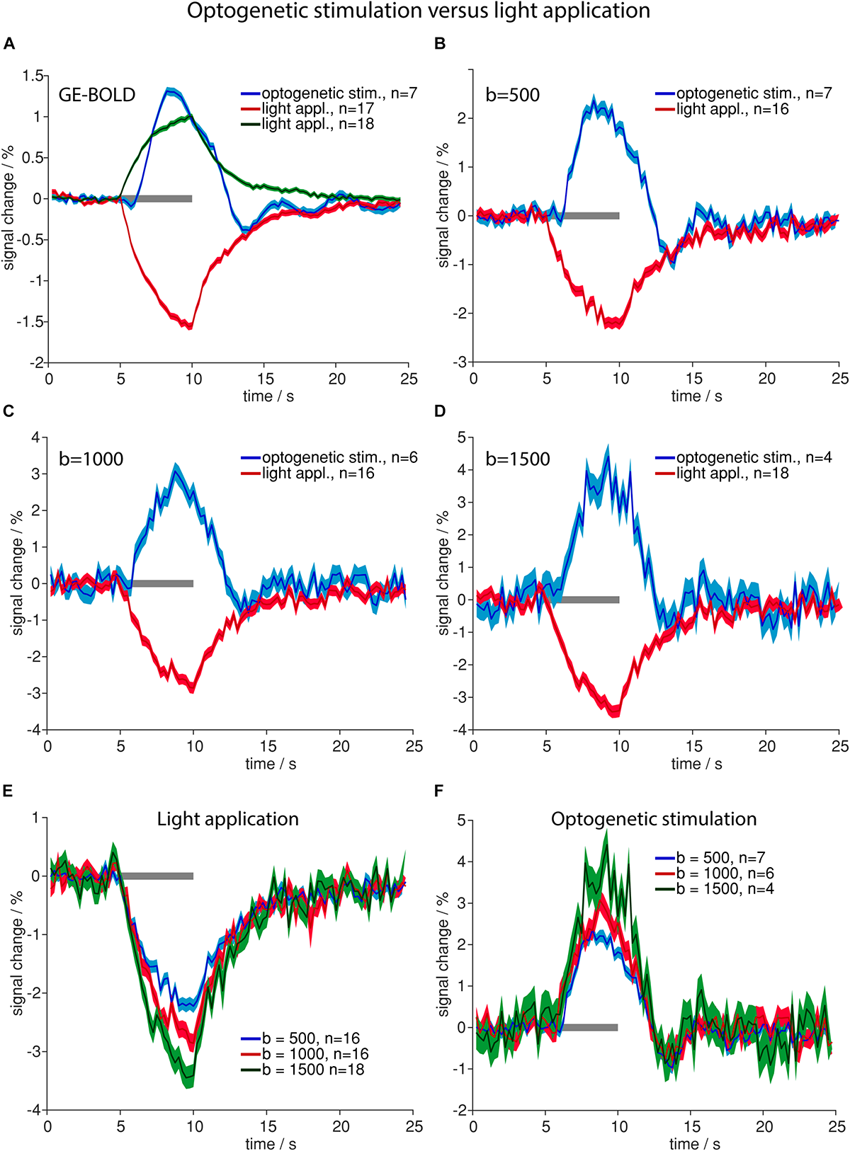 Comparison of high-intensity light application and optogenetic stimulation. (A–D) Averaged time courses upon optogenetic stimulation (blue line in A–D) and light application (positive changes in green in A, negative changes in red in A–D) for GE-BOLD (A), diffusion with b = 500 s/mm2(B), diffusion with b = 1000 s/mm2(C) and diffusion with b = 1500 s/mm2(D) are shown. Signal change upon light application begins with the stimulation and signal rises until stimulation stops. In contrast, signal change upon optogenetic stimulation begins delayed and reaches its peak before the end of stimulation. (E) Averaged signal changes upon high-intensity light application for diffusion sequences with b = 500 s/mm2 (blue), 1000 s/mm2 (red) and 1500 s/mm2 (green) are shown. (F) Averaged signal changes upon optogenetic stimulation for diffusion sequences with b = 500 s/mm2 (blue), 1000 s/mm2 (red) and 1500 s/mm2 (green) are shown. In both, (E,F), amplitude rises with increasing diffusion weighting. All time courses were acquired with TR 250 ms. Gray bars indicate stimulation periods, mean ± SEM is shown, n indicates number of measurements. All mean time courses are based on time courses extracted with the GLM analysis. High-intensity light application was always performed in naïve animals that did not express opsins.
