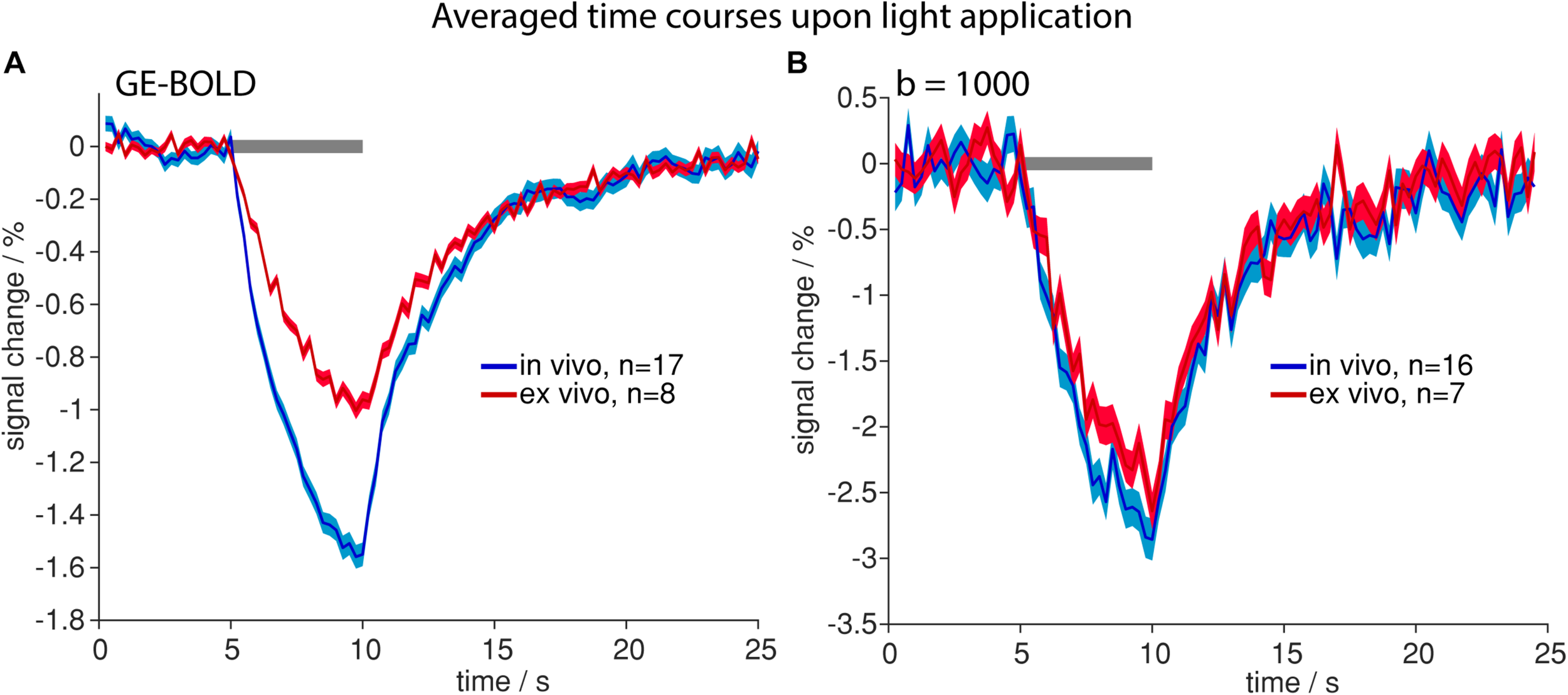 Time courses of signal changes were markedly different for high-intensity light application as compared to electric stimulation. Upon light application signal started to increase immediately, following an exponential saturation curve, and instantly started to decrease exponentially after end of light application. Electric stimulation by contrast resulted in a delayed signal increase according to the well-known HRF (Figure 2).