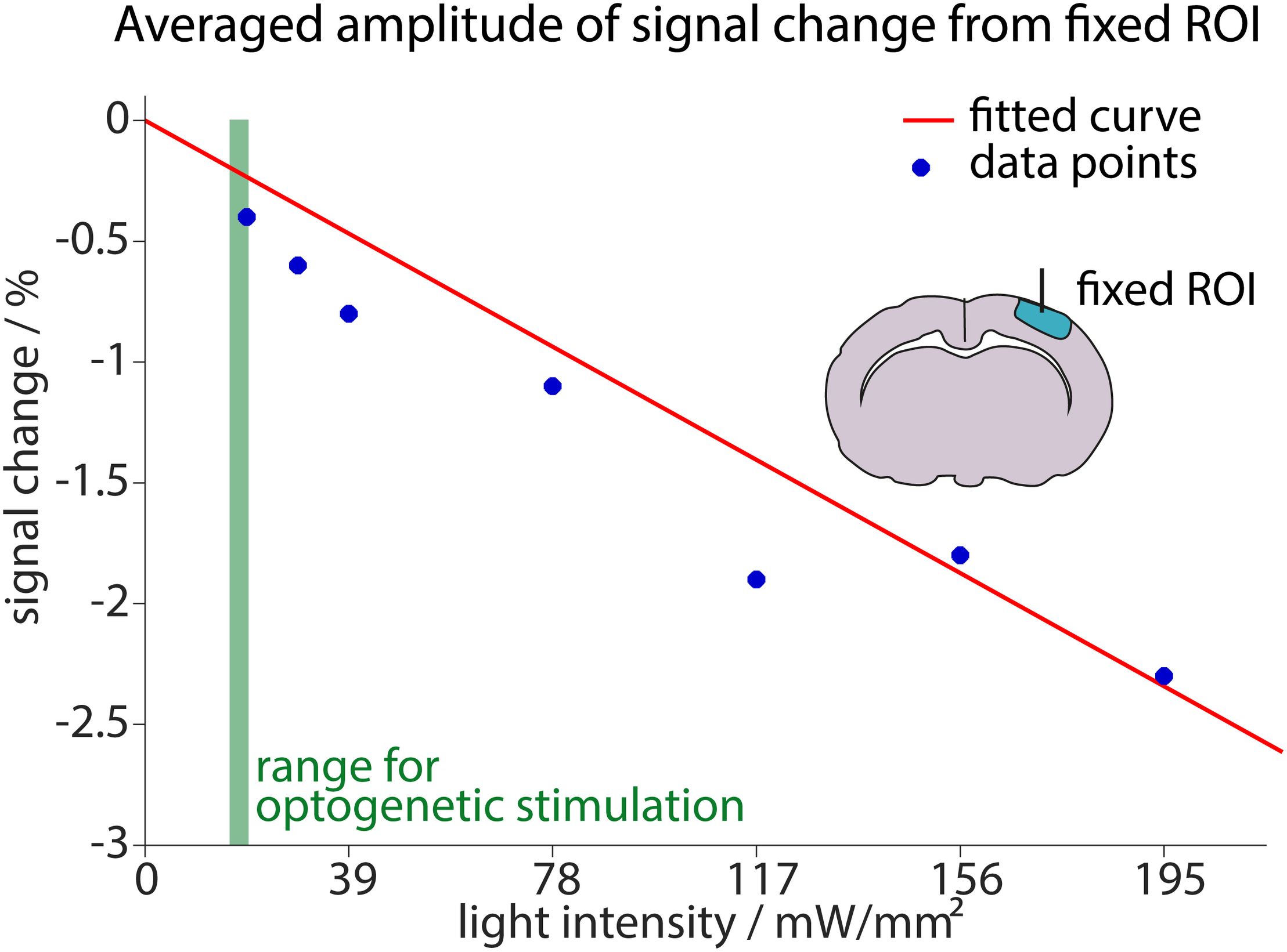 Data from experiment 1 were also used to estimate the effect of low-intensity light application during optogenetic stimulation on the BOLD response. Even when signal changes do not reach statistical significance, they may diminish the resulting BOLD signal. To extract the largest effect on the BOLD response, a small ROI (circa 1 × 2 mm) covering the area directly around the fiber was chosen. In this ROI data were averaged across all voxels and across stimulation trials to obtain time courses for single measurements. All measurements from one light application condition (i.e., 19.5 mW/mm2, 29 mW/mm2 etc.) were averaged to obtain mean time courses for different light intensities. For each averaged time course the peak amplitude was extracted. The amplitudes were plotted against the used light intensities and fitted with a linear fit that was forced to include the origin (0, 0).