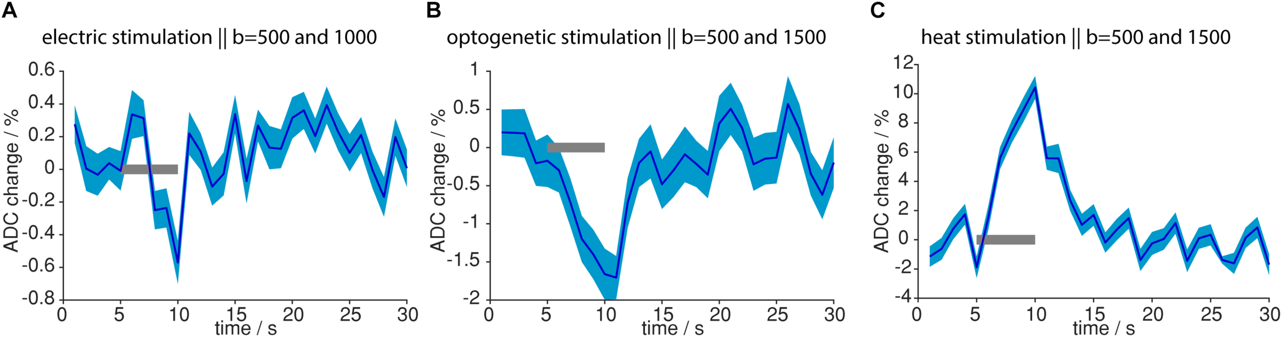 The apparent diffusion coefficient (ADC) was calculated from measurements with different b-values. For b1 > b2 the ADC is given by ADC = ln(Sb2/Sb1)/(b1−b2). Sb1 is the signal from measurements with b1. The error was calculated according to the propagation of uncertainty to be:, with ΔSb1/2 the SEM of Sb1/2. For the ADC calculation all measurements belonging to one condition e.g., electric stimulation with b = 500 s/mm2 were summed up. Then, ADC values were calculated for electric stimulation, optogenetic stimulation and light application. For each stimulation the b-value combination with the largest difference was chosen, i.e., b = 500 s/mm2 with b = 1000 s/mm2 for electric stimulation and, b = 500 s/mm2 with b = 1500 s/mm2 for optogenetic stimulation and light application. All shown ADC changes are smoothed by a moving average filter that averaged four measurement points together.