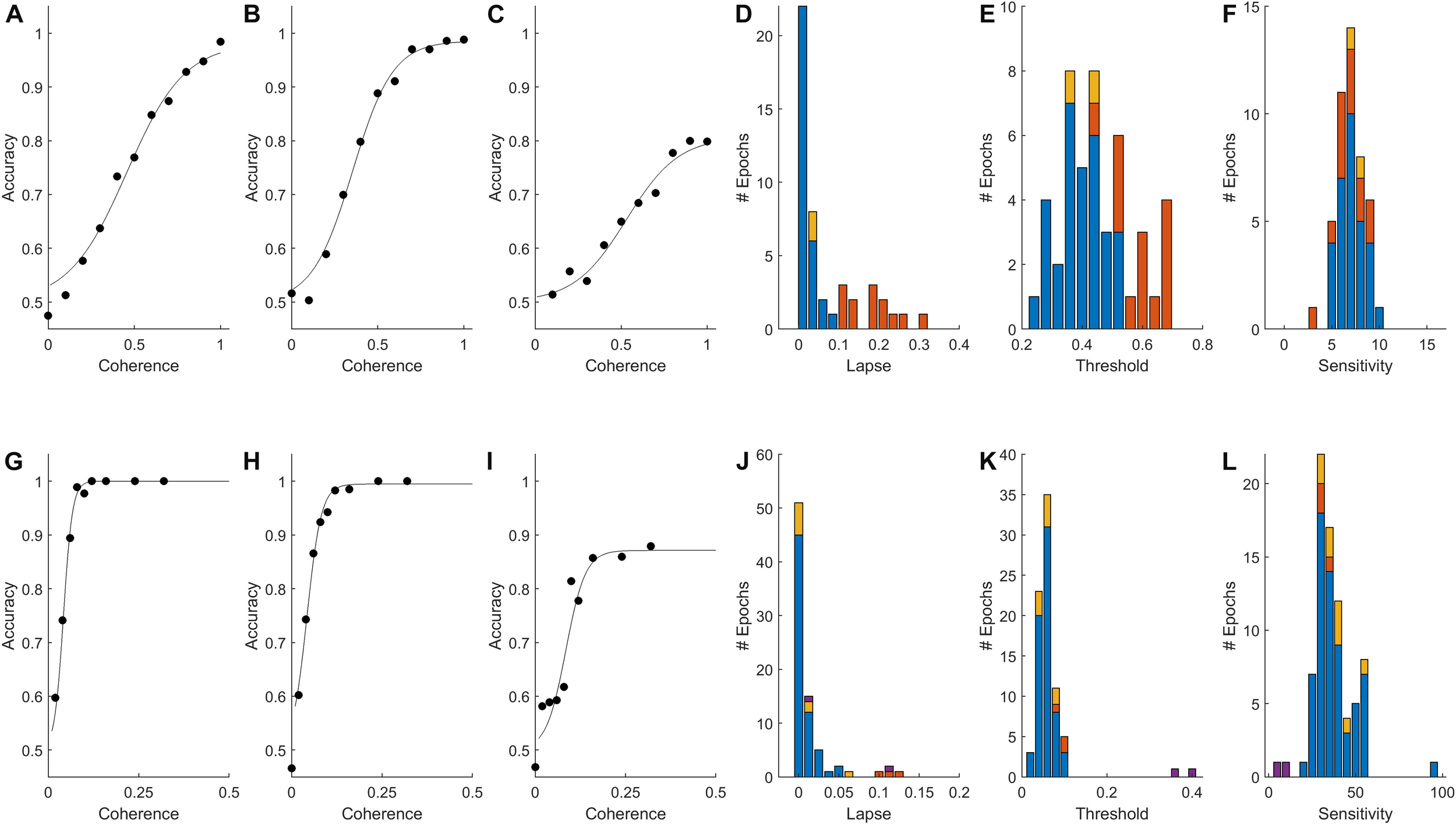 Psychometric functions of rat and human populations. (A–C,G–I) Accuracy (fraction correct) as a function of stimulus strength (coherence) for three rats (A–C) and three humans (G–I) from our data set. Points indicate fraction correct among trials at the indicated coherence. Curves are psychometric fits, from which we obtain lapse (extrapolated error rate at 100% coherence), threshold (coherence at 75% correct), and sensitivity (slope of psychometric curve) for each epoch (see section Materials and Methods). (D,J) Distribution of lapse among qualifying epochs of rats and humans respectively (see Materials and Methods for inclusion criteria). (E,K) Distribution of motion discrimination threshold. (F,L) Distribution of motion sensitivity; note different scales. In all histograms in this figure, blue indicates epochs with <10% lapse and no bias; red indicates epochs with >10% lapse (e.g., C,I), some of which were also biased; yellow indicates epochs with response bias but not lapse; and purple indicates an atypical visually impaired human subject. The outlier near 100 in (L) is the example shown in (G).