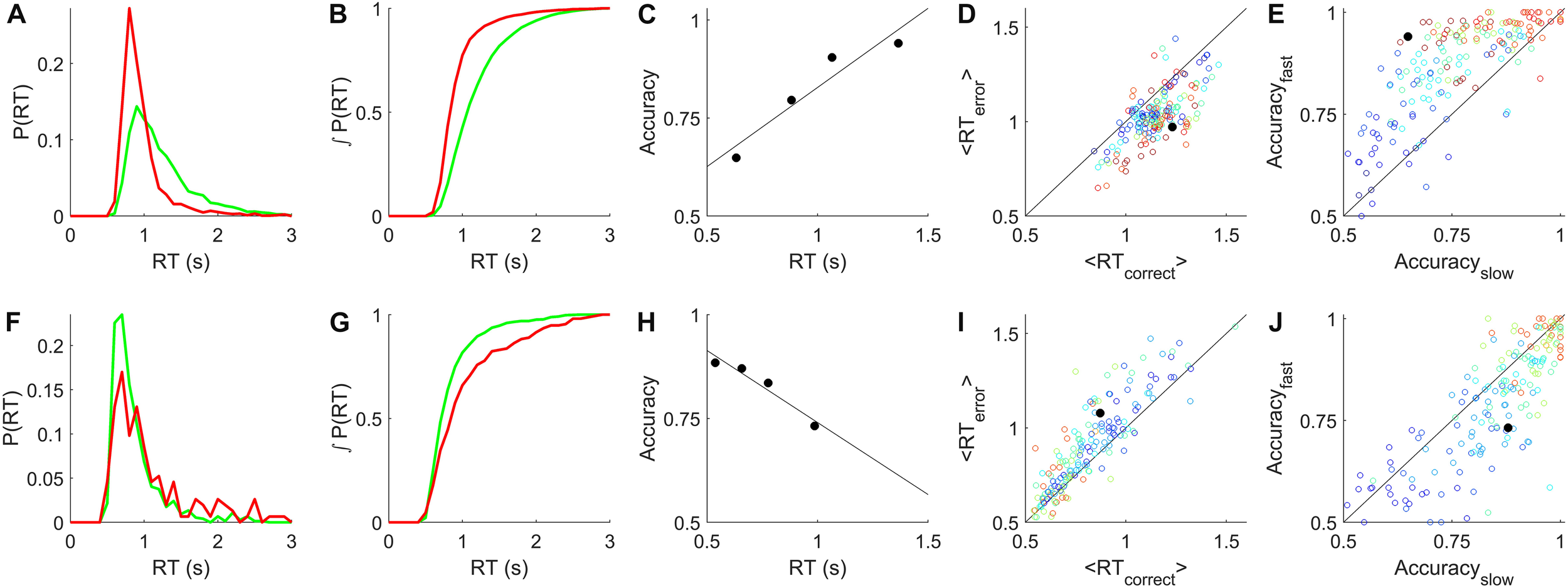 One way to visualize the species difference is to compare the reaction time distributions of errors to that of correct trials. For rats, we found that the reaction time distributions of correct trials had heavier tails (Figure 2A), causing a rightward shift of the cumulative probability distribution of correct trials relative to errors (Figure 2B). Therefore accuracy increased with reaction time (Figure 2C). For rats in general, the average reaction time of correct trials was greater than that of error trials of the same coherence within the same experimental test block (Figure 2D). Therefore the accuracy of slow responses was lower than that of fast responses (Figure 2E). For humans, we found the opposite: reaction times of errors were longer, and therefore accuracy declined with reaction time (Figures 2F–J). Thus we can replicate the result that has been widely reported in past studies of humans and monkeys, using the same trial structure, task implementation, and data analysis procedures that yields the opposite result for rats.