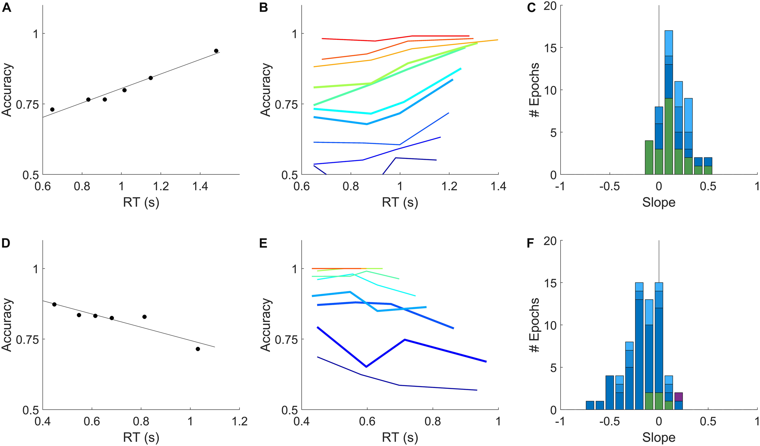 Analysis of slopes of accuracy vs. reaction time in different subsets of epochs.
