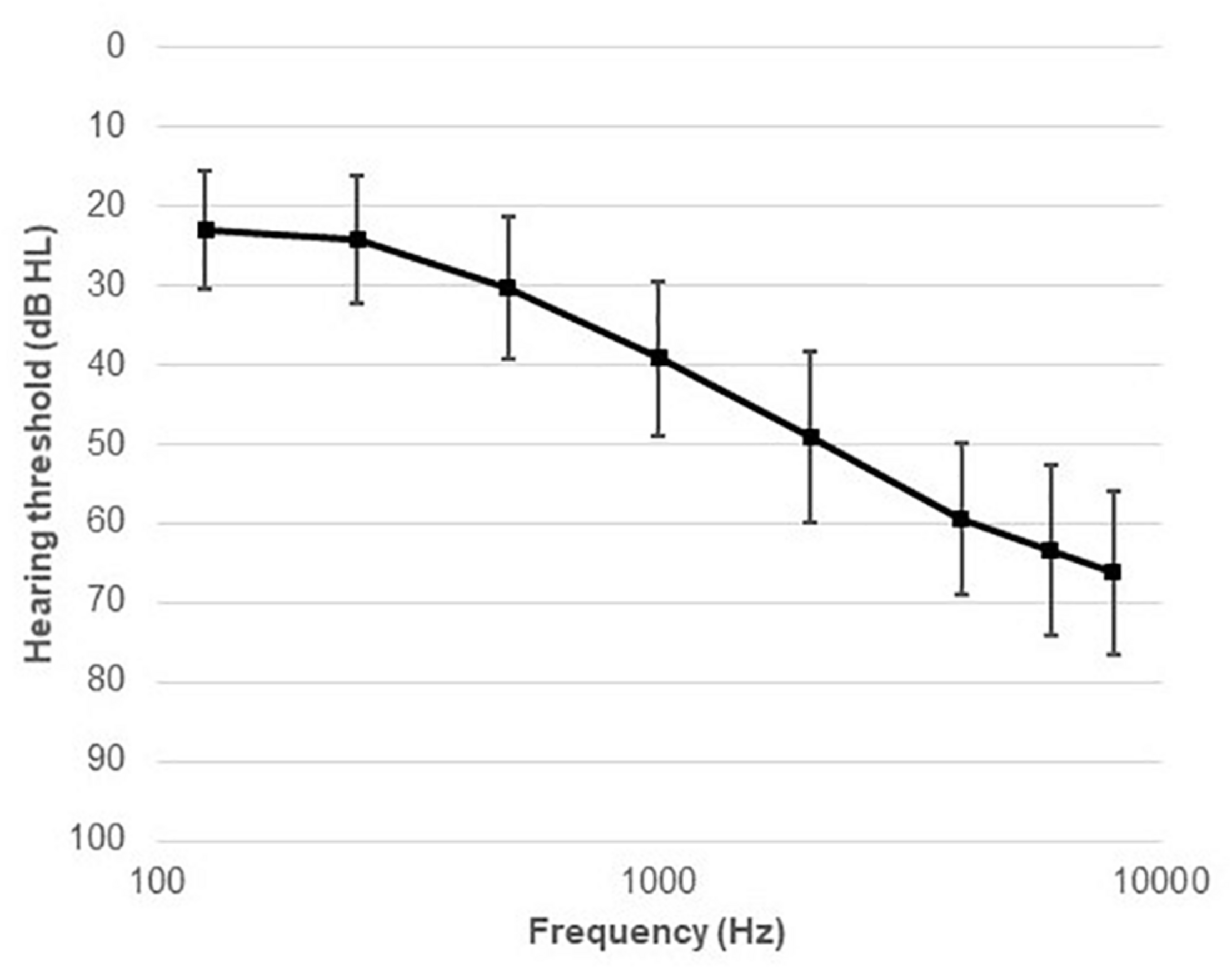 Average audiometric thresholds (mean and SD) across the entire frequency range measured (125–8,000 Hz).