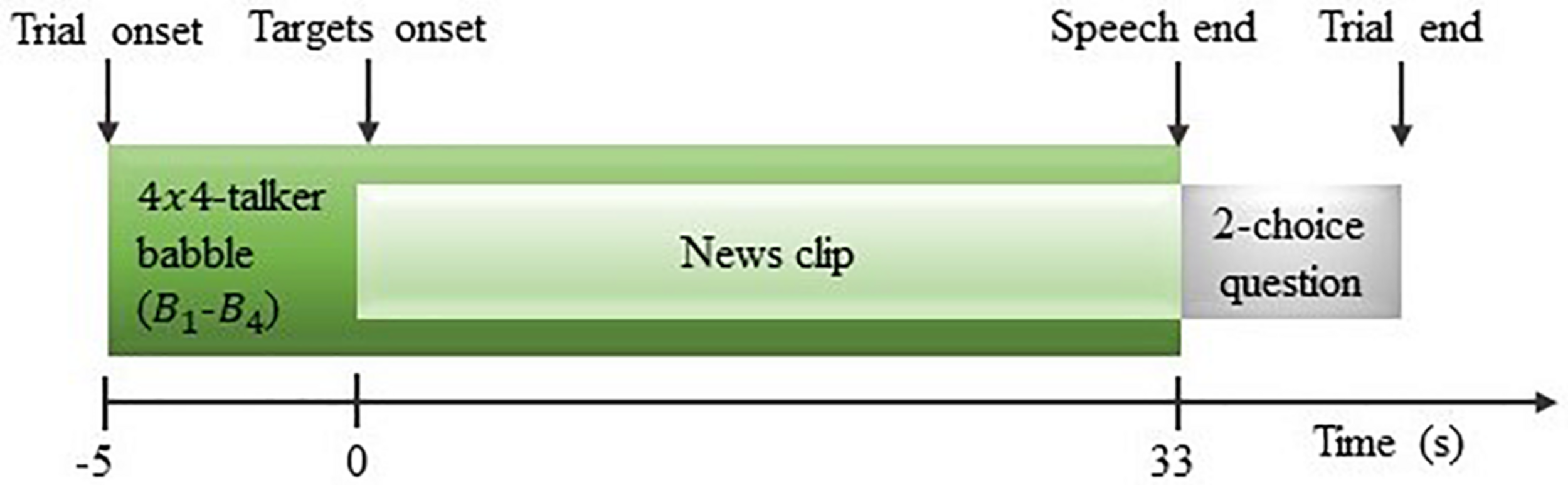 A total of 84 trials were conducted, with four trials used for training and 80 trials used for testing and analysis. Each trial consisted of a short period of silence, 5 s of background noise followed by 33 s of simultaneous stimuli from all speakers, as illustrated in Figure 4. After each trial, a two-choice question about the content of the attended speech was presented to the participant to ensure sustained attention.