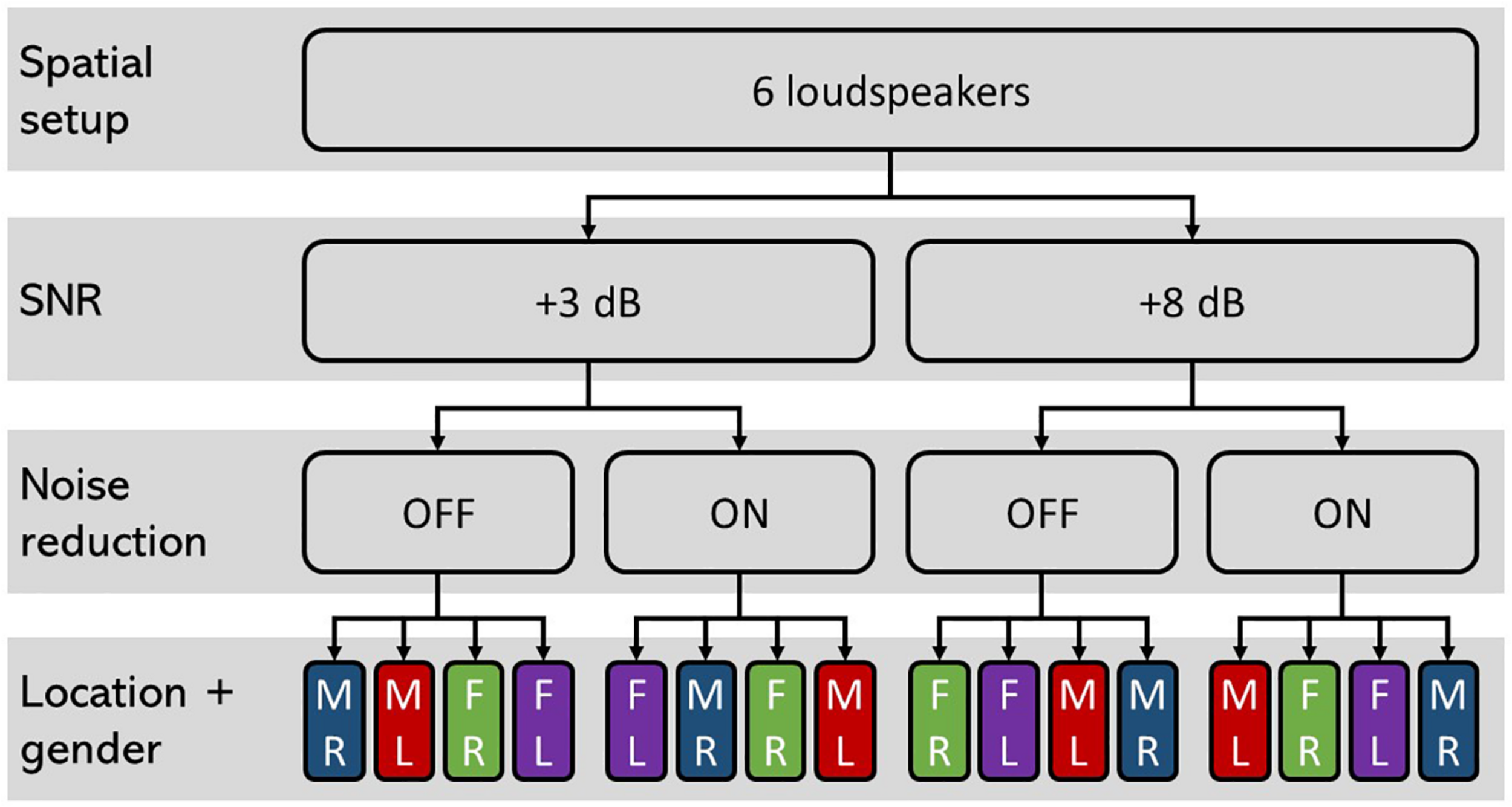 Schematic illustration of the study design. The four conditions “+3 dB OFF,” “+3 dB ON,” “+8 dB OFF,” and “+8 dB ON” were tested with 20 trials each. For each condition, the trials were randomized with five consecutive trials with attended speaker being “male right (MR),” “male left (ML),” “female right (FR),” and “female left (FL).” The order of these subconditions was randomized between conditions and participants and were applied to avoid bias toward one of the speakers or spatial awareness.