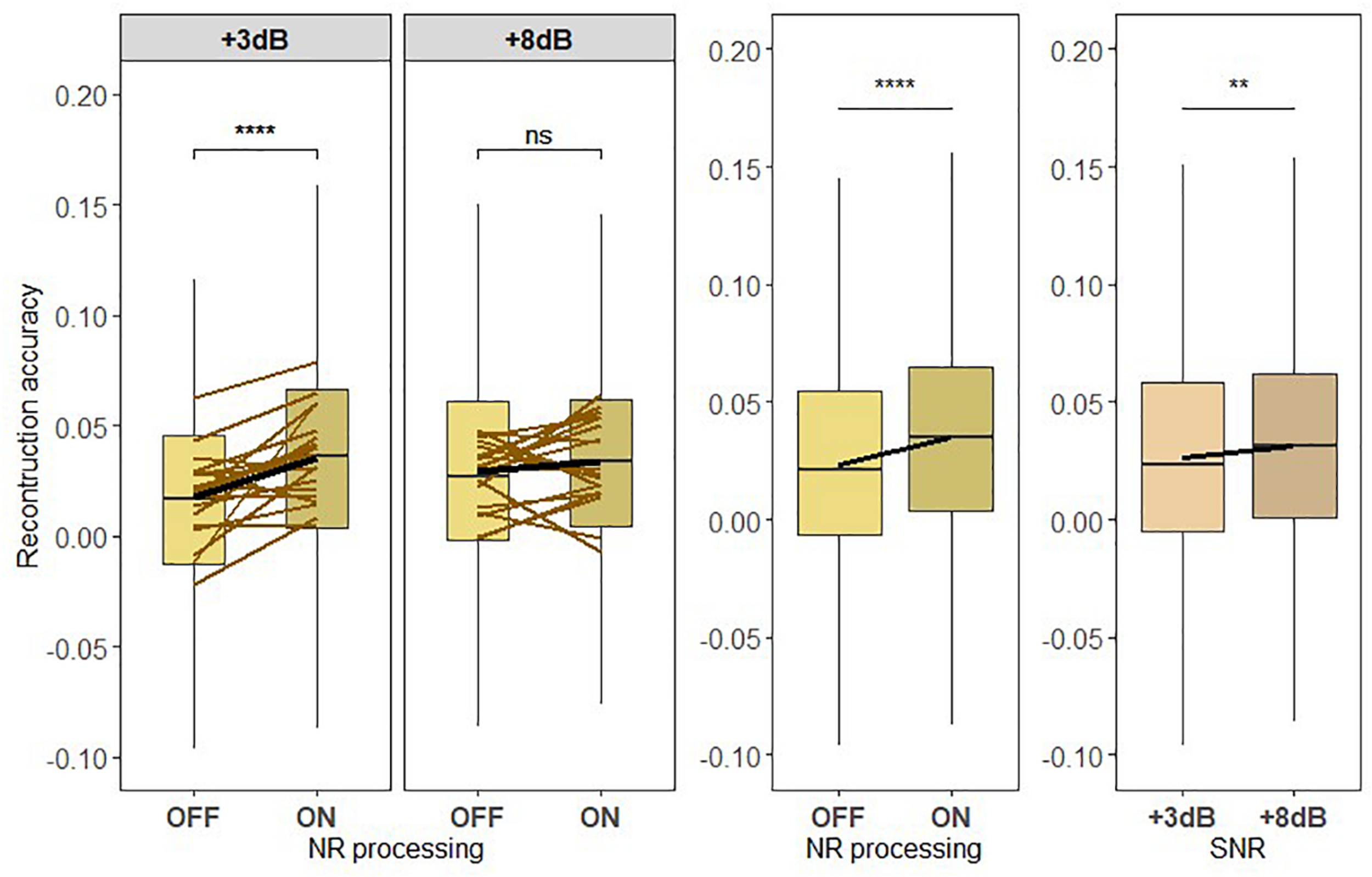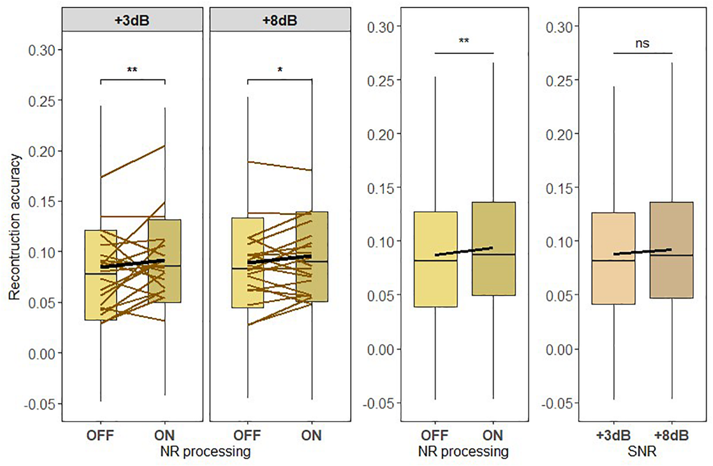 The NR scheme gives an overall SNR improvement of approximately +5 dB. For example, Ohlenforst et al. (2018) used a similar NR scheme and settings. In a test setup where a single target speaker was presented in two different types of background noise, the NR scheme provided SNR improvements up to +5.2 dB. The SNR improvement was further verified in technical measurements done in the specific test setup of the present study, which had two target talkers instead of one. The details of the technical measurements, together with the description of the NR scheme, are discussed in the “MATERIALS AND METHODS” section. Based on the approximately 5-dB SNR improvement provided by the NR scheme, the two SNR levels tested in this study also allowed us to investigate whether the SNR improvement provided by the NR scheme can be translated to a corresponding +5 dB of “neural SNR” improvement or, in other words, whether the NR-enhanced neural representation of the attended talker corresponds to a +5-dB shift in the reconstruction accuracy. This would be tested by comparing the test conditions +3 dB SNR with active NR (resulting in +8 dB SNR output from HA) and +8 dB SNR with inactive NR.