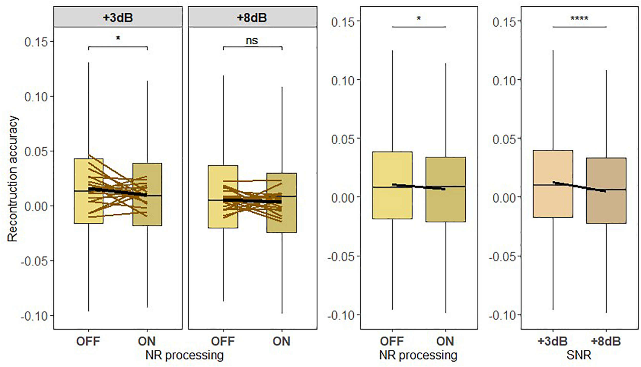 (H3) The active NR processing reduces the neural representation of the background noise across low and high signal-to-noise ratio (SNR) level. Boxplot showing the reconstruction accuracy values of the ignored background noise envelope reconstructed from the ignored noise decoder for two SNR levels tested with noise reduction (NR) scheme inactive (OFF) or active (ON; left column) for global averages across NR schemes (middle column) and for global averages across SNR levels (right column). A significant main effect of NR, indicating the reduced neural representation of the ignored background noise when NR scheme was turned on, and a significant main effect of SNR were observed. A significant difference in reconstruction performances between inactive and active NR in the pairwise comparison at lower SNR (+3 dB) was observed. The horizontal lines in yellow denote single participants and the horizontal lines in black depict predictions of linear mixed models. The black horizontal line in the boxplot denotes the mean reconstruction accuracy of the ignored background noise envelope and the box indicates the upper and the lower quartiles, with the vertical lines representing the minimum and the maximum reconstruction accuracy values. The asterisk indicates significant differences (*p < 0.05, ****p < 0.0005); ns, not significant.