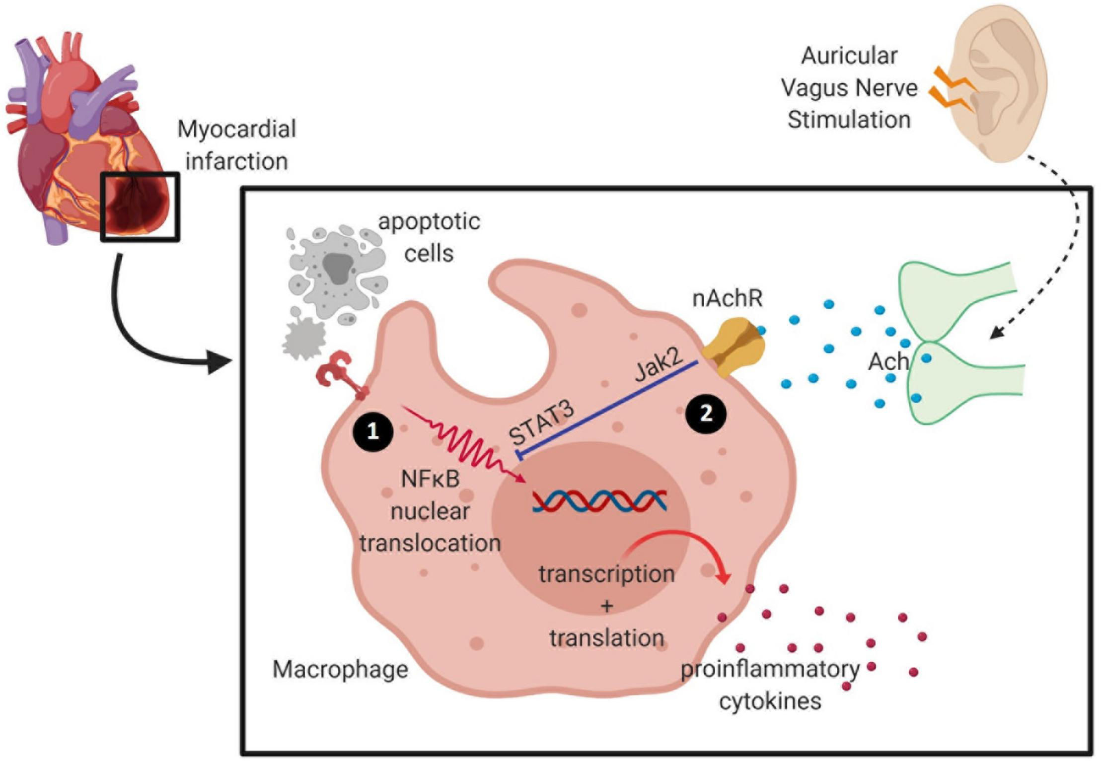The anti-inflammatory mechanism of VNS remains unclear. One hypothesis is that vagal activation inhibits NFκB translocation and phosphorylation, therefore curtailing inflammatory signaling (Han et al., 2014). During acute MI, inflammatory signals (e.g., TNFα, IL-6) are released by the injured cells and bind to toll-like receptors to assist with the translocation and phosphorylation of NFκB, a transcriptional activator for inflammatory response (Han et al., 2014). It has also been postulated that α7nAChR activation triggers the CAP via Janus kinase (JAK)2-STAT3 signaling, a known negative regulator for inflammatory responses (De Jonge and Ulloa, 2007). Interestingly, in vivo studies reported elevated pro-inflammatory macrophages with activated STAT3 in hypertension, a known predisposing factor for MI (Loperena et al., 2018). Further, an in vitro study using endothelial cells revealed an activation of STAT3 due to an increased endothelial stretch (Loperena et al., 2018). Meanwhile, inhibition of STAT3 prevented the monocyte inflammatory response toward a dysfunctional endothelium (Loperena et al., 2018). Hence, it is pivotal to understand the mechanistic interventions of α7nAChR activation to enhance STAT3 activity in mediating anti-inflammatory roles in MI and other related conditions.