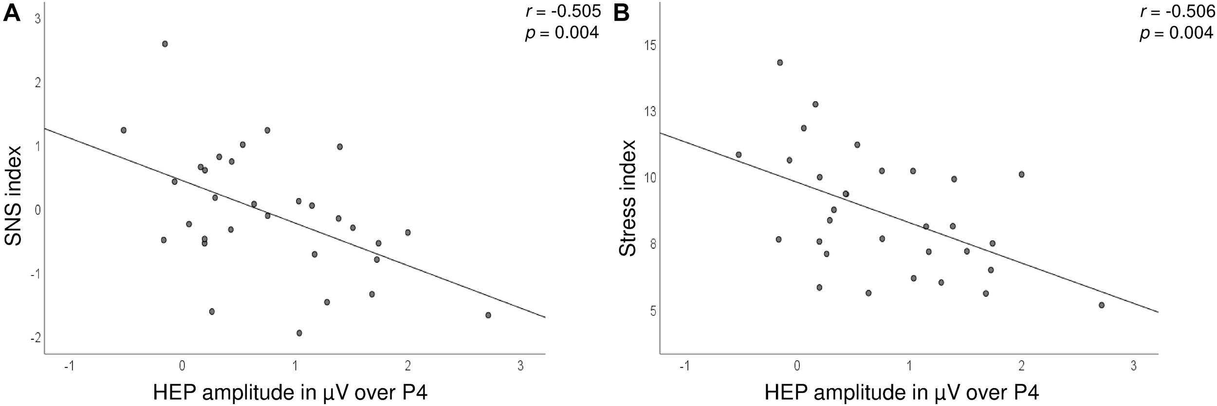 Significant correlations between the HEP amplitudes and HRV measures were found during the satiety conditions. In detail, the Stress and SNS indices were negatively associated with HEP amplitudes over the P4 electrode, which suggest lower amplitudes during high SNS activity (Figure 5 and Table 2). The correlations for Δ pre–post data for P4 electrode as well as correlations over C4 for post data did not survive correction for multiple testing.