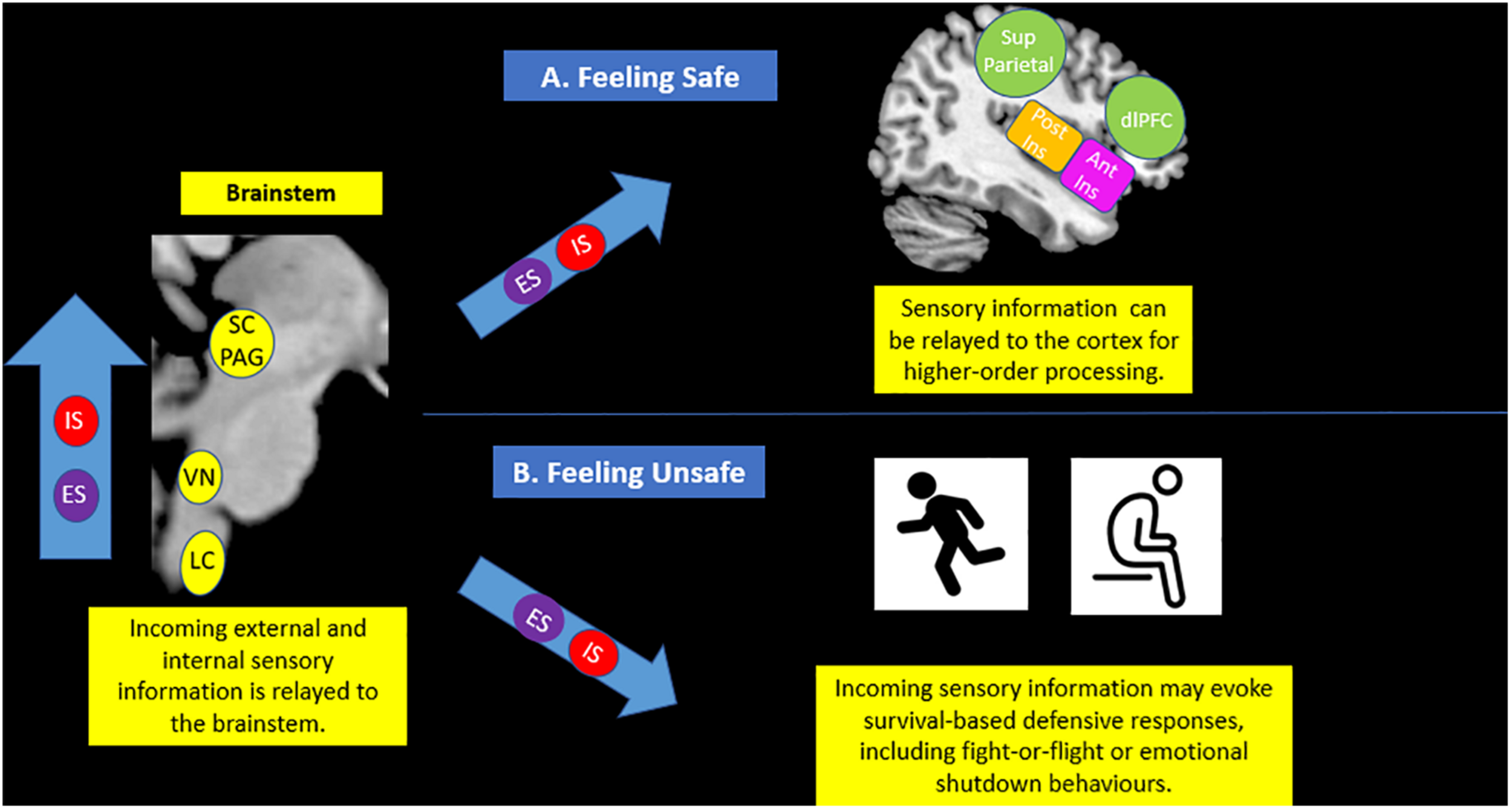 Brainstem sensory processing. The brainstem is responsible for receiving incoming exteroceptive sensations from the external environment (ES) and simultaneous interoceptive affective sensations stemming from within the body (IS). If an individual feels safe (A), it is thought that sensory information can be effectively relayed to areas of the cortex, including the insula and the prefrontal cortex, for advanced processing. However, if an individual feels unsafe (B), incoming sensory information may cause fluctuations in arousal that evoke survival-based active and passive defensive responses, including fight-or-flight and emotional shutdown behaviors. IS (Internal Sensations), ES (External Sensations), SC/PAG (Superior Colliculus/Periaqueductal Gray), VN (Vestibular Nuclei), LC (Locus Coeruleus), Post Ins (Posterior Insula), Ant Ins (Anterior Insula), Sup Parietal (Superior Parietal Cortex), dlPFC (Dorsolateral Prefrontal Cortex).