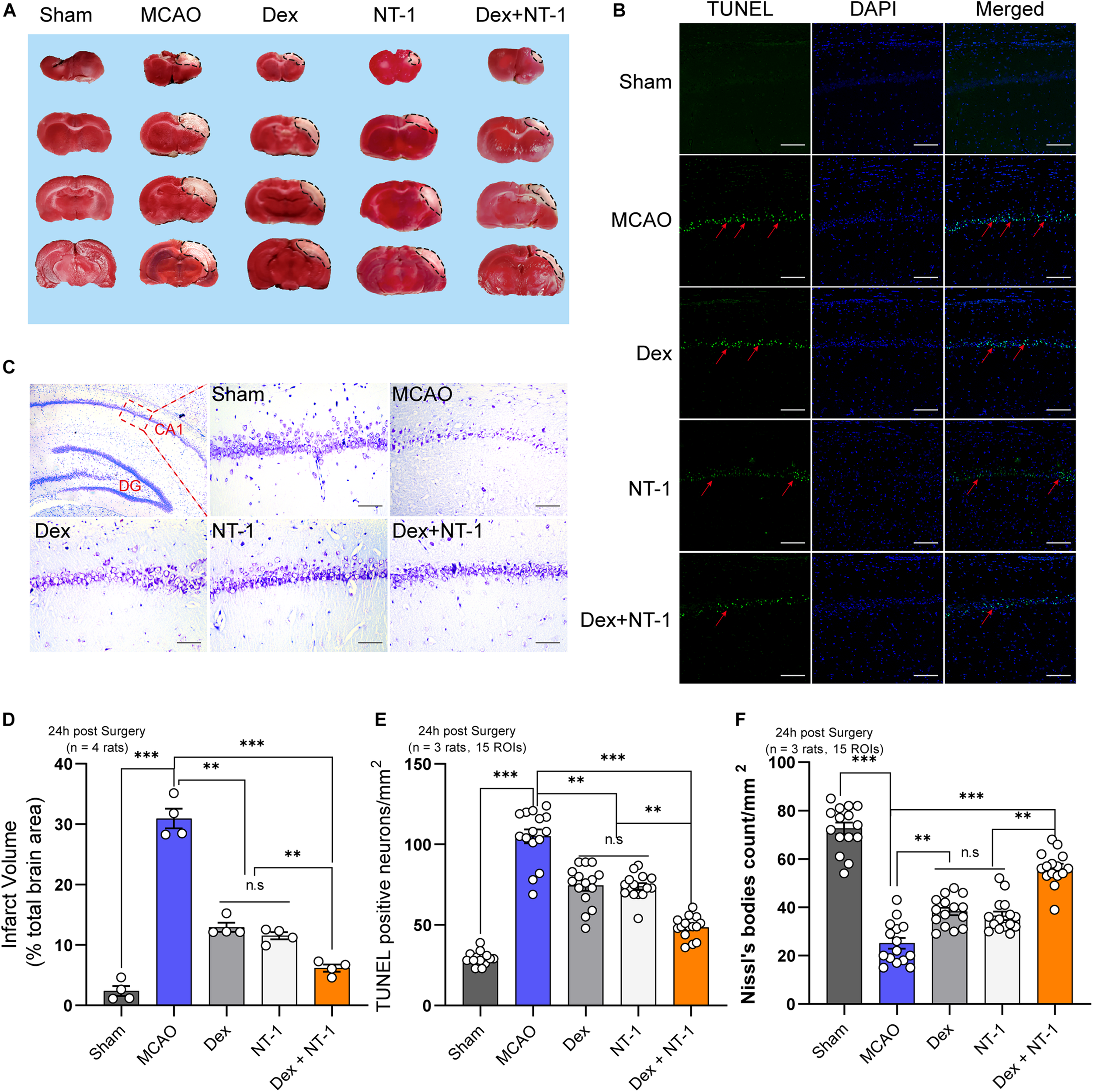 Combination of dexmedetomidine and Netrin-1 reduced the neuronal injury after MCAO injury. (A) TTC staining after MCAO injury, the red area represents normal tissue and the white area represents infarcted tissue. (B) Representative images of TUNEL-positive cells (green) in the hippocampal CA1 region. The nuclei were stained with DAPI. Scale bar = 200 μm. (C) Nissl staining of the surviving cells in the hippocampal CA1 region. Scale bar = 200 μm. (D) Percentage of infarct volume after TTC staining. (E) Quantitative analysis of TUNEL-positive neurons. (F) Quantitative analysis of Nissl-positive neurons. Data are shown as the mean ± SD. ∗∗P < 0.01 and ∗∗∗P < 0.001 using one-way ANOVA followed by Tukey’s post hoc tests.