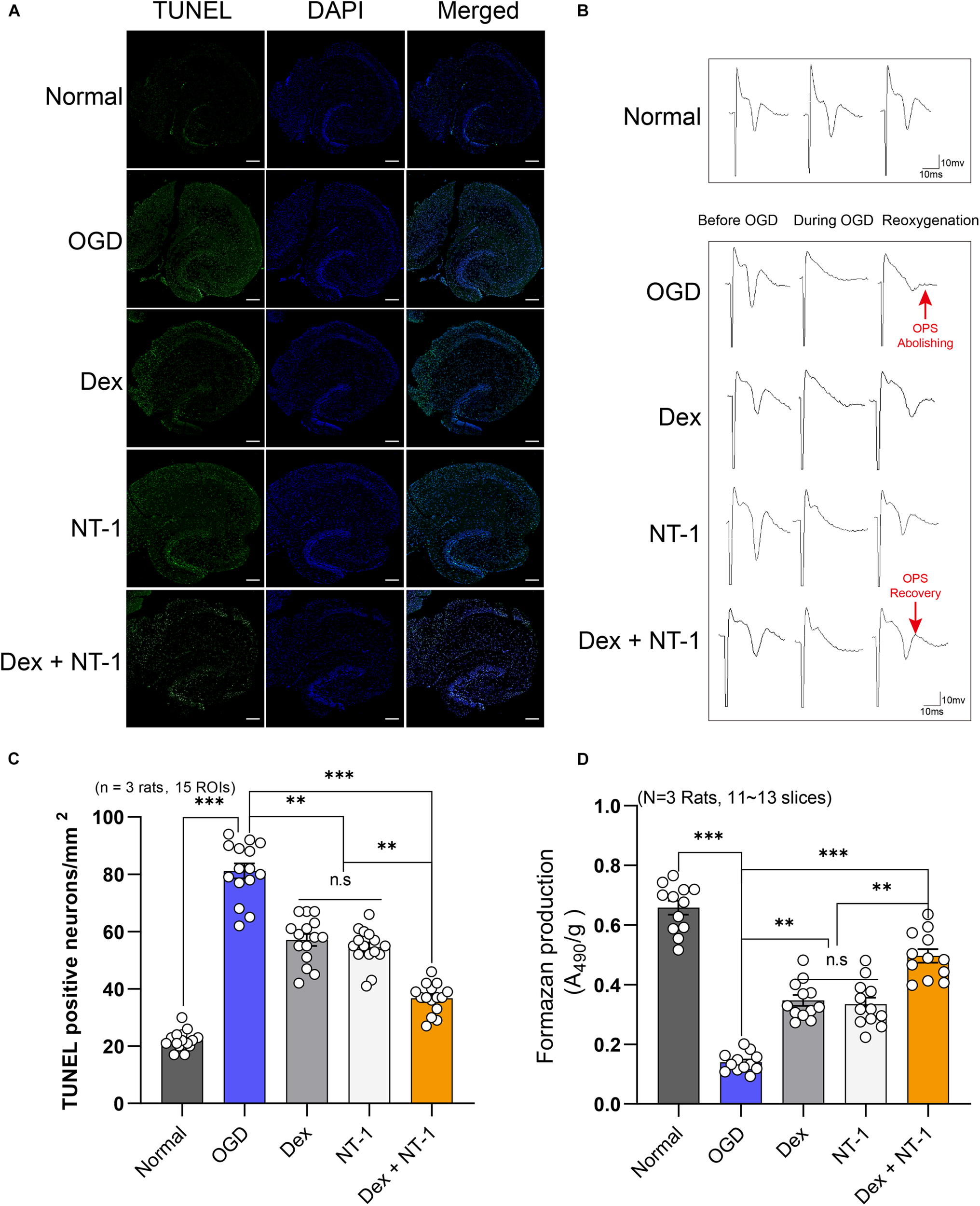 In vivo, TUNEL-positive cells in the hippocampal CA1 region were analyzed, and OGD experiment was performed for in vitro hippocampal slice perfusion, and the changes of TUNEL-positive cells were further analyzed (Figures 4A,C). The numbers of TUNEL-positive cells in the OGD group were higher than those in the Normal group (P < 0.01). Both dexmedetomidine and Netrin-1 perfusion treatment reduced apoptosis (P < 0.01), but no significant difference existed among the Dex and NT-1 group (P > 0.05). However, combined with the dexmedetomidine and Netrin-1, the numbers of TUNEL-positive cells significantly decreased (P < 0.01) (Figure 4C).