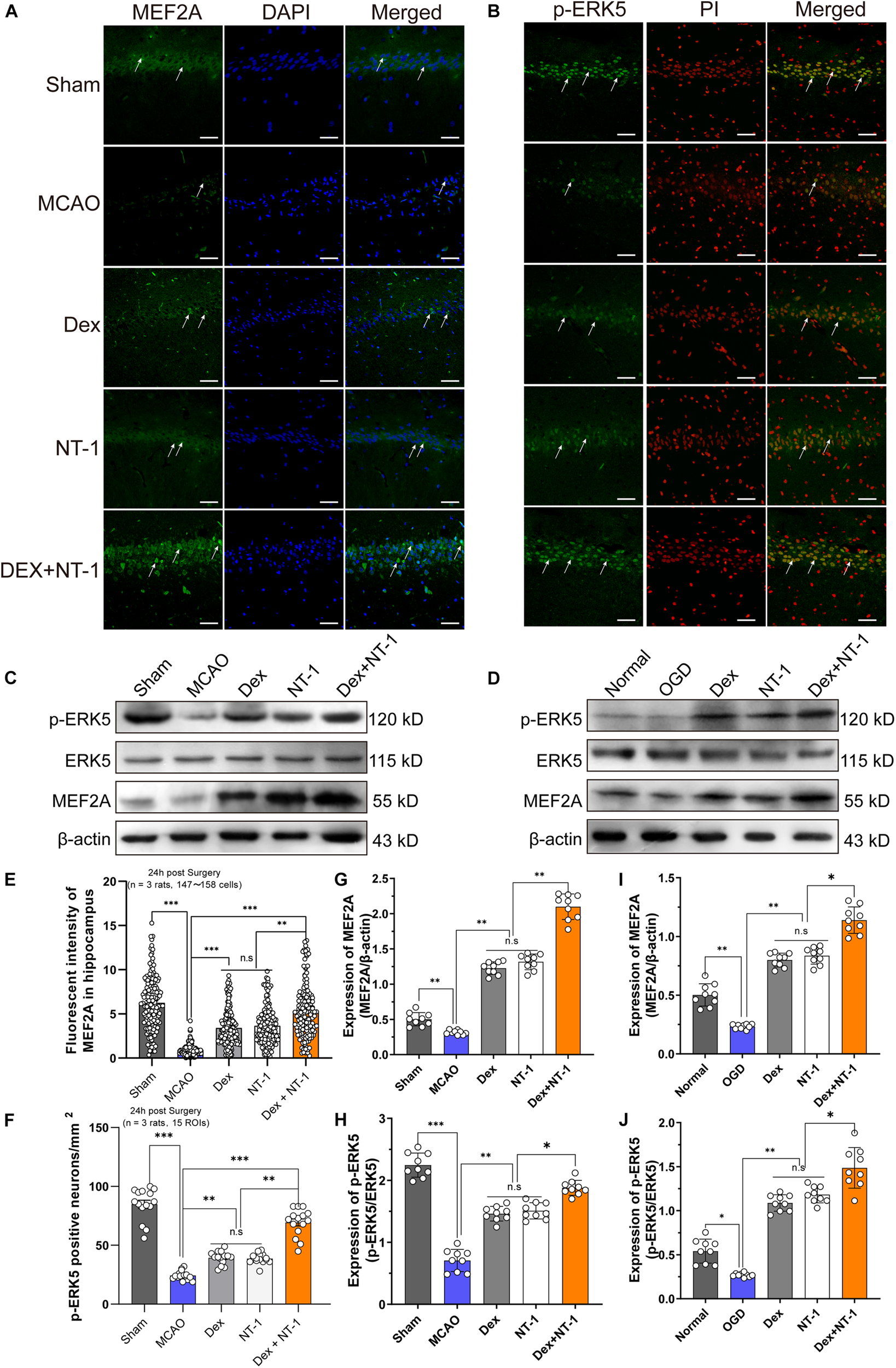 Dexmedetomidine and Netrin-1 up-regulated the expression of the ERK5 and MEF2A after MCAO injury and OGD injury. (A) MEF2A expressions in hippocampus after MCAO injury. Immunofluorescence staining exhibited positive cells of MEF2A. Green indicated MEF2A expression in plasm of pyramidal neurons, and blue indicated the nucleus. Scale bar = 100 μm. (B) p-ERK5 expressions in hippocampus after MCAO injury. Immunofluorescence staining exhibited positive cells of p-ERK5. Green indicated p-ERK5 expression in nucleus of pyramidal neurons, and red indicated the nucleus. Scale bar = 100 μm. (C,D) Western blot analysis of MEF2A, ERK5 and p-ERK5 proteins, β-actin was used as an internal control. (E–I) Quantitative analysis of MEF2A and GRP78 expression levels. (F–J) Quantitative analysis of p-ERK5 expression levels. ∗P < 0.05, ∗∗P < 0.01 and ∗∗∗P < 0.001 using one-way ANOVA followed by Tukey’s post hoc tests.
