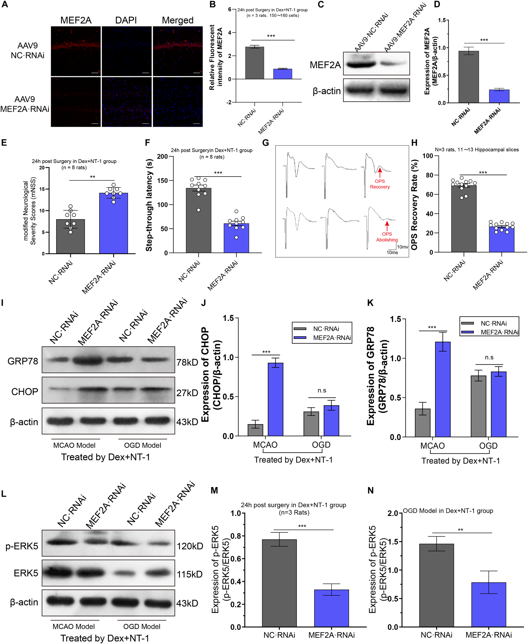 Knockdown MEF2A weakened the therapeutic effect of dexmedetomidine combined with Netrin-1 after MCAO and OGD injuries. (A,B) Immunofluorescence staining exhibited downregulation in MEF2A expression in the hippocampus at 14 days after AAV9-MEF2A RNAi microinjection. (C,D) Western blot analysis shows downregulation in MEF2A expression in the hippocampus at 14 days after AAV9-MEF2A RNAi microinjection. (E) The mNSS result after MEF2A knockdown. (F) The step-through latency result after MEF2A knockdown. (G,H) The OPS recovery rate after MEF2A knockdown. (I–K) Western blot analysis of ERS-related proteins CHOP and GRP78 in the hippocampus at 14 days after AAV9-MEF2A RNAi microinjection, β-actin was used as an internal control. (L–N) Western blot analysis of ERS-related proteins ERK5 and p-ERK5 in the hippocampus at 14 days after AAV9-MEF2A RNAi microinjection, β-actin was used as an internal control. ∗∗P < 0.01 and ∗∗∗P < 0.001 using one-way ANOVA followed by Tukey’s post hoc tests.