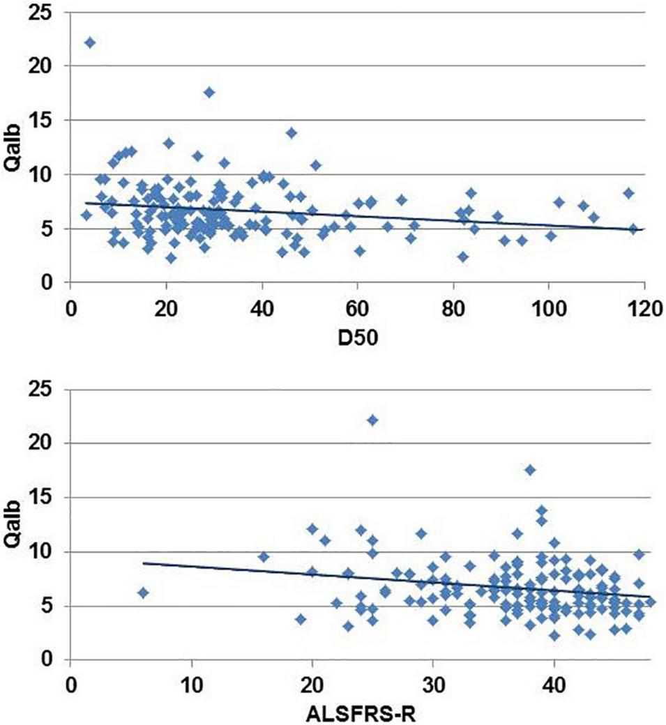 Univariate correlation between disease aggressiveness (D50) and revised ALS-Functional Rating Scale Revised (ALSFRS-R) with the albumin CSF/serum quotient (Qalb).
