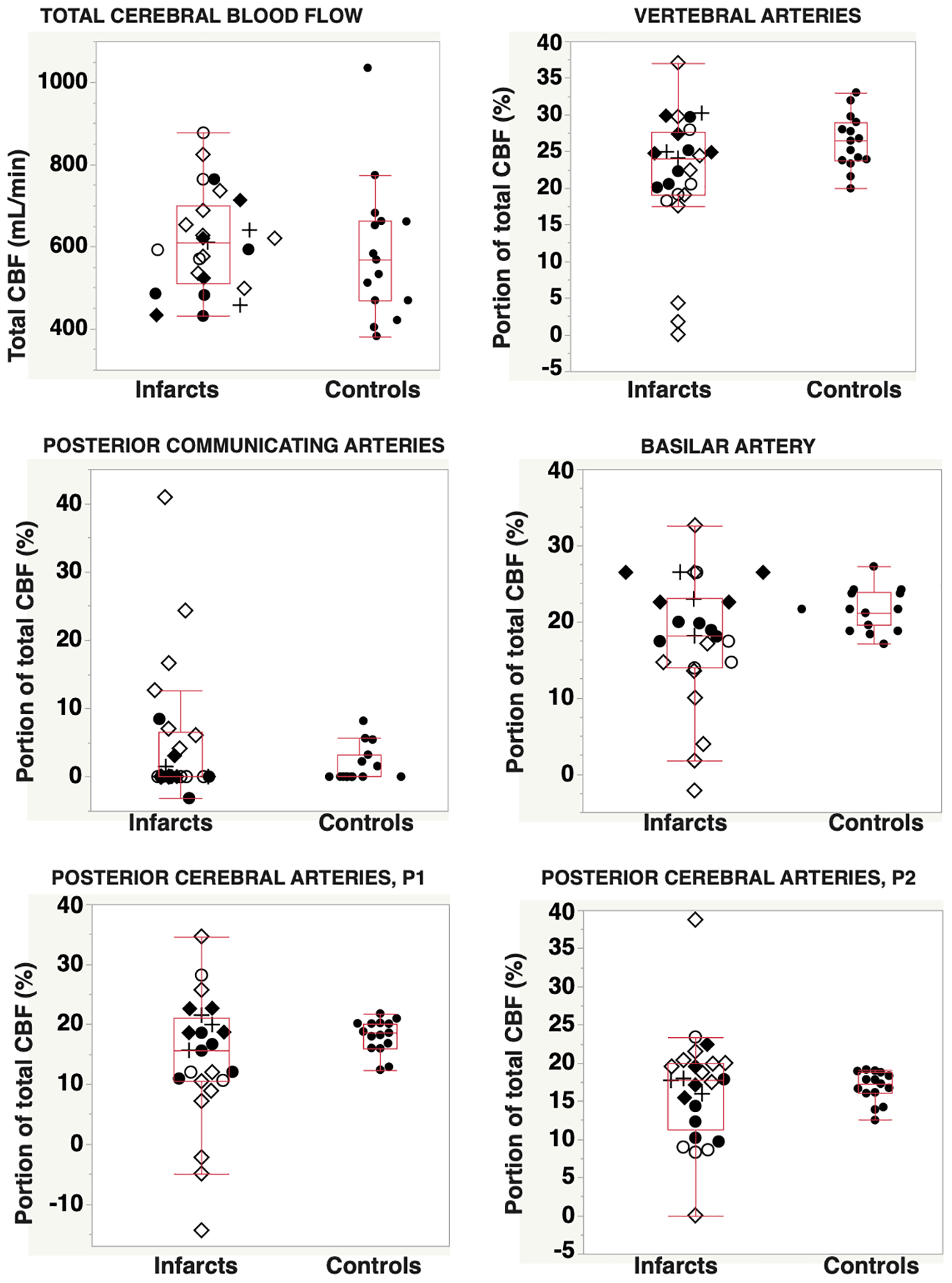 Total cerebral blood flow and distribution of total CBF into the posterior circulation vascular tree, for patients with posterior circulation infarcts (n = 25) and for controls (n = 15). Abbreviations: ⋄, infarction in the proximal/middle territory and CTA-verified occlusion or stenosis of VA and/or BA; ◆, infarct located in the proximal/middle territory, but without angiography findings in VA or BA; ○, infarction in the distal territory and CTA verified occlusion or stenosis in the PCA; ●, infarct located in the proximal/middle territory, without angiography findings in the PCA; and +, brain stem infarcts classified as proximal/middle territory infarcts and without corresponding CTA findings. CBF, cerebral blood flow; CTA, computed tomography angiography; VA, vertebral arteries; BA, basilar artery; PCA, posterior cerebral artery.