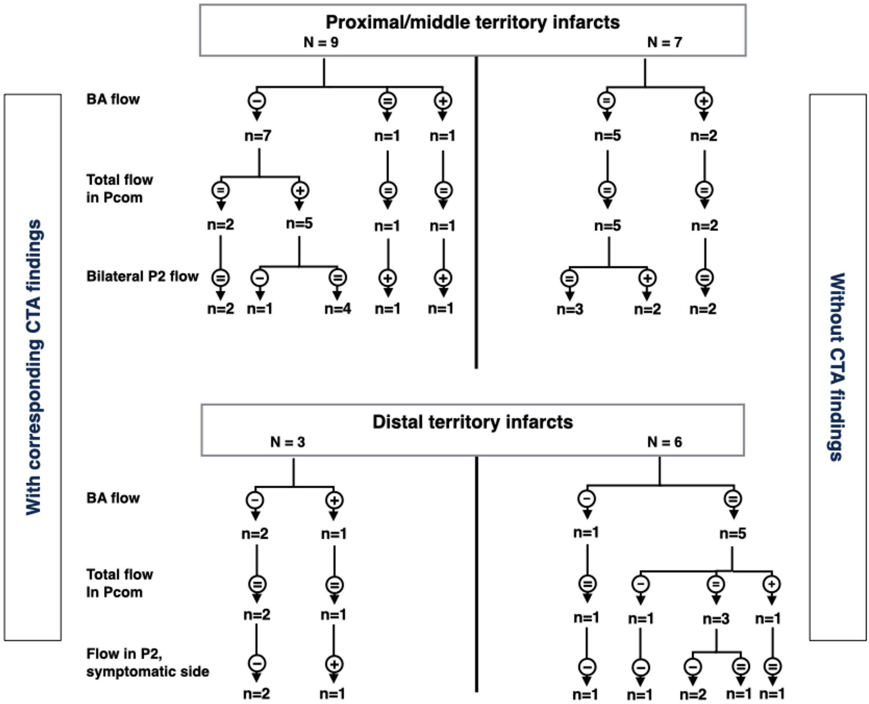 Based on DW-MRI, 13 patients in this study had proximal or middle territory infarcts (nine had a corresponding stenosis or occlusion on CTA); nine patients had distal territory infarcts on DW-MRI (four had a corresponding stenosis or occlusion on CTA). Two patients had brainstem infarcts and a third normal DW-MRI, all of them without stenosis/occlusions on CTA. According to location on imaging and symptoms, those three patients were classified as proximal territory infarcts. ICC for flow measurements was 0. 98 [95% CI (0.96, 0.99)], which was considered excellent.