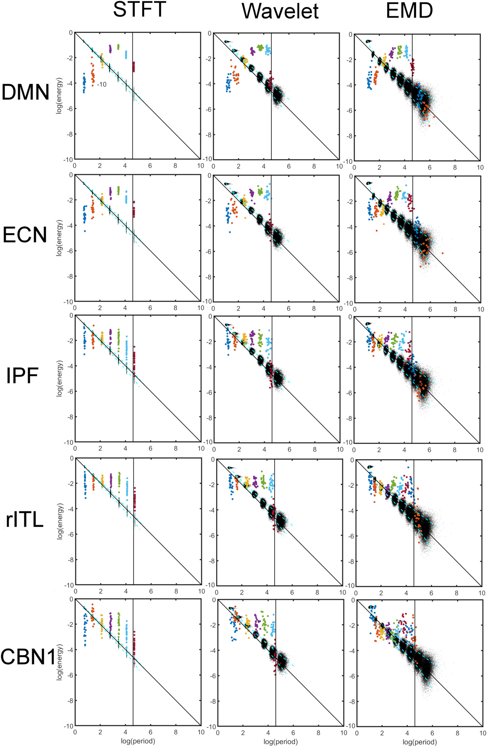 Figure 5. Comparison of energy and period profiles using three different analysis methods (Short-Time Fourier Transform (STFT), Maximal Overlap Discrete Wavelet Transform (MODWT), Empirical Mode Decomposition (EMD)) applied to five different resting-state networks (Default Mode Network (DMN), Executive Control Network (ECN), Inferior Prefrontal Network (IPF), right Inferior Temporal Network, Cerebellar Network 1 (CBN1). As before (see Figures 2, 4), the black dots represent a data decomposition of white Gaussian noise. Dots of the same color correspond to the same component of the decomposition, i.e., dyadic frequency interval decomposition for STFT, detail level decomposition of the wavelet transform, and intrinsic mode function (IMF) decomposition for EMD. There are 22 dots with the same color corresponding to the 22 subjects studied. The vertical line corresponds to the cut-off frequency of 0.01 Hz, and information to the right of this line (i.e., frequencies lower than 0.01 Hz) is of no interest in this study. Note that these 5 networks were chosen to be representative networks of the clusters 1 to 5 in Figure 10.