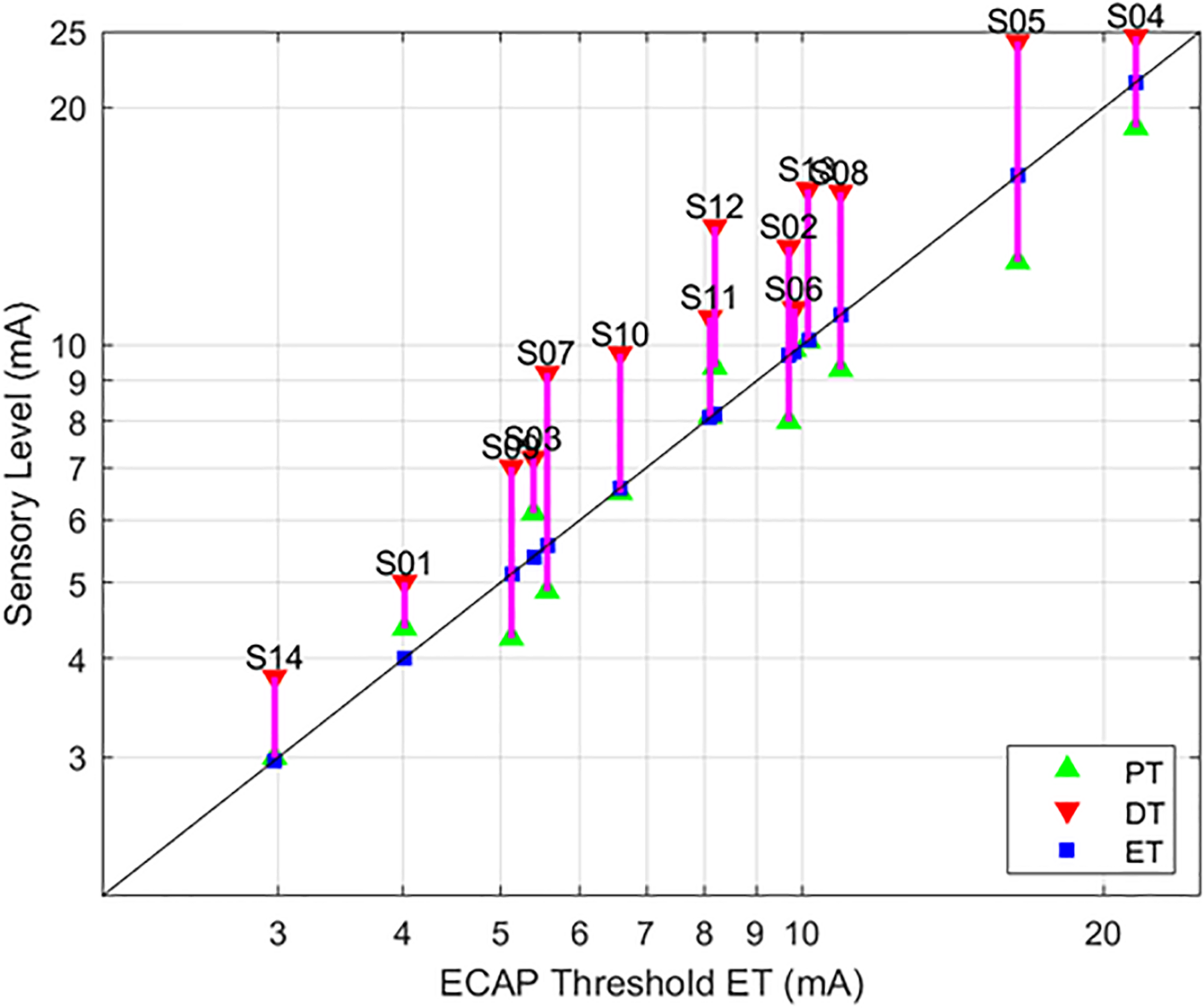 Relationships between PT and DT as a function of ET. The stimulation currents resulting in PT (green, upwards triangle) and DT (red, downwards triangle) are plotted with respect to ET; ET is also marked with a blue square for ease of reference. A green triangle without a corresponding red triangle indicates cases where DT could not be measured. In these circumstances, the required current was in excess of the maximum stimulation setting (25 mA) of the research system.