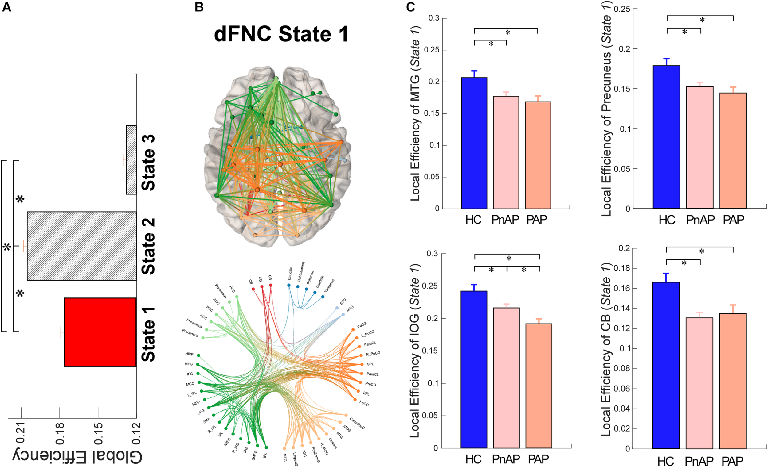 Local Efficiency of dFNC states. (A) Comparisons of averaged local efficiency among brain states. (B) Functional connectivity profile of state 1 and its connectivity mapping to the ICBM152 brain template. (C) Group differences in local efficiency of ICNs within state 1. Bars represent the mean of occurrences and error bars represent the SEM. ∗Significance p < 0.05, FDR corrected.